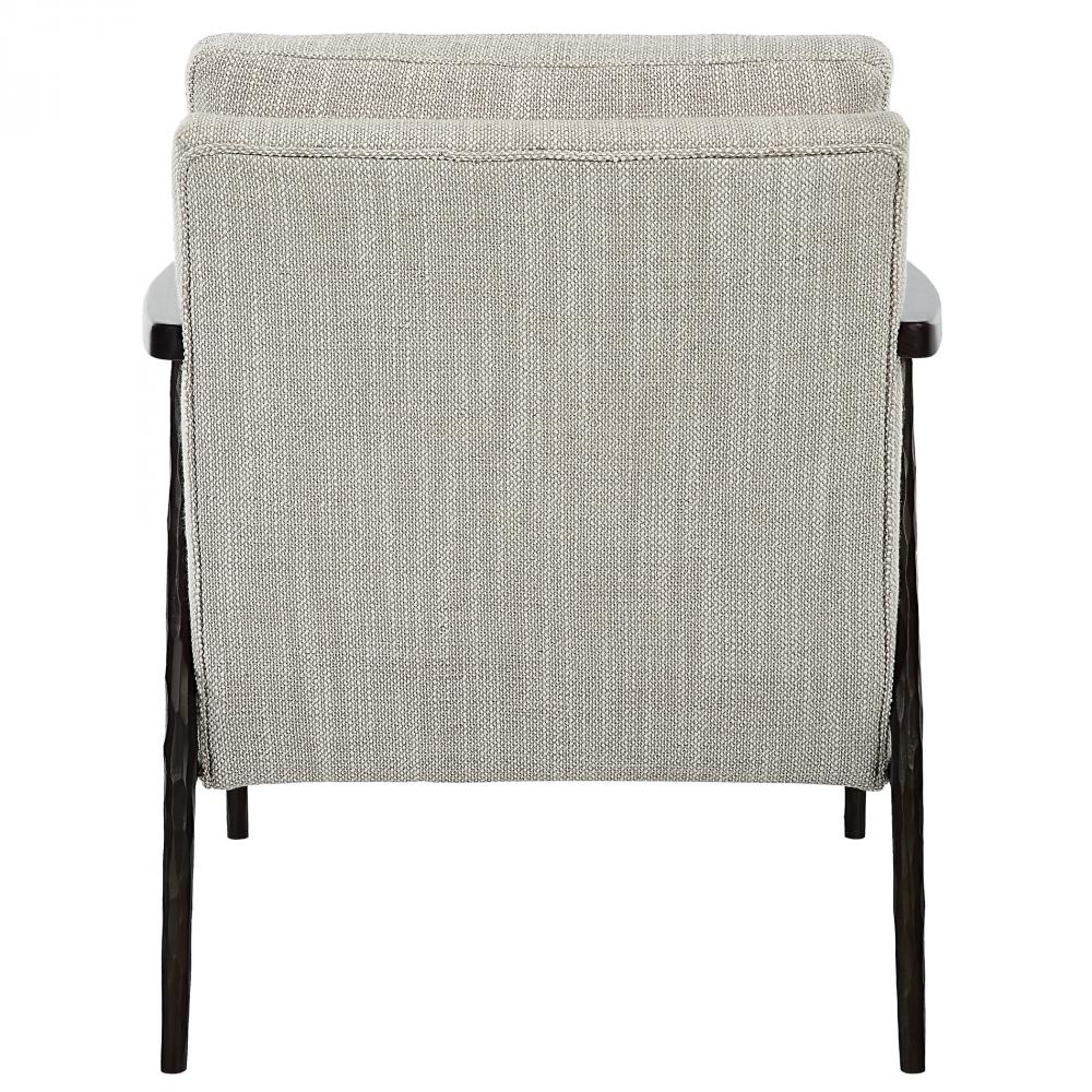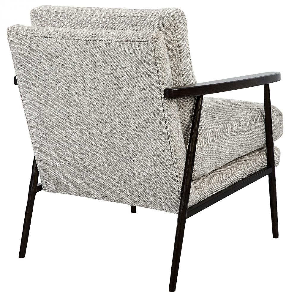 A Modern Mix of Materials with Hints of Masculinity, This Accent Chair Features A Textured Cast Iron Frame in Dark Bronze with Dark Walnut Finished Solid Oak Arms. Tailored in A Neutral Polyester Weave in Ivory and Beige Tones. Seat Height is 18".