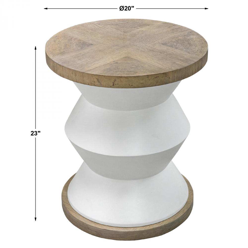 This Modern Side Table Showcases A Geometric Base Finished in Matte White. The Top Features A Light Honey Toned Stain Over An Oak Veneer Marquetry Pattern, with Burl Accents.