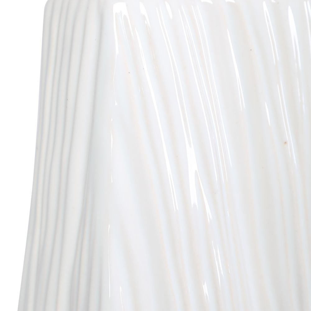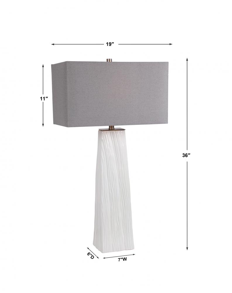 Elegant and Versatile, This Table Lamp Features A Gloss White Ceramic Base Featuring Organic Hand Carved Details and Brushed Nickel Accents. The Piece is Paired with A Rectangle Hardback Shade in Gray Linen Fabric with Natural Slubbing.