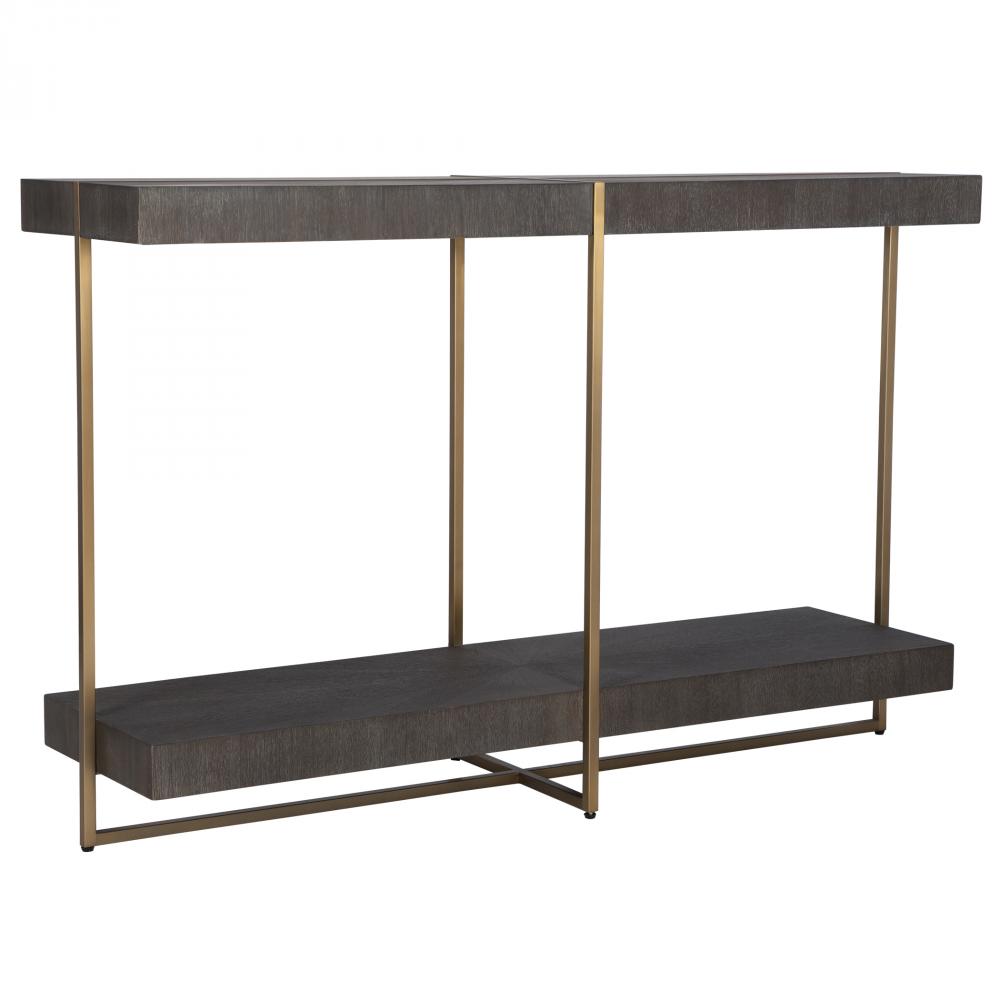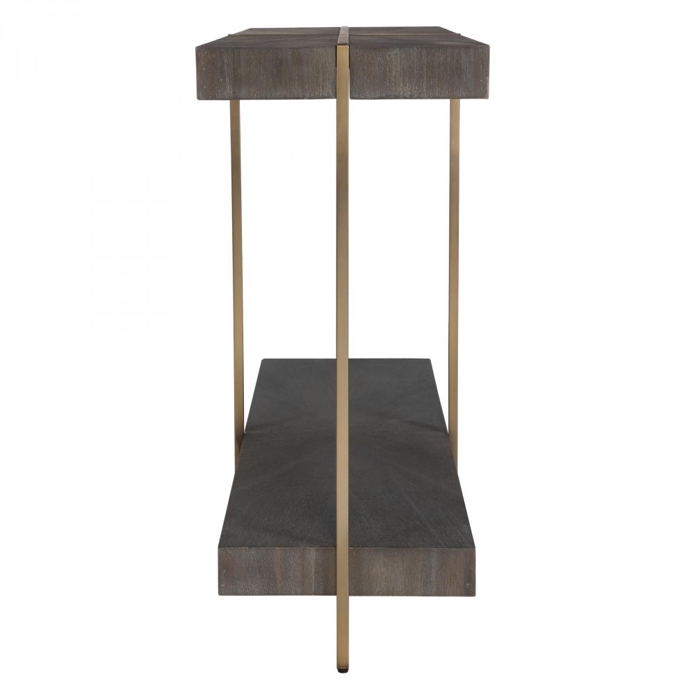 Contemporary in Style, This Console Table Features A Stainless Steel Framework Finished in A Brushed Brass with A Starburst Acacia Veneer Top in A Dark Walnut Stain Washed with A Light Gray Glaze.