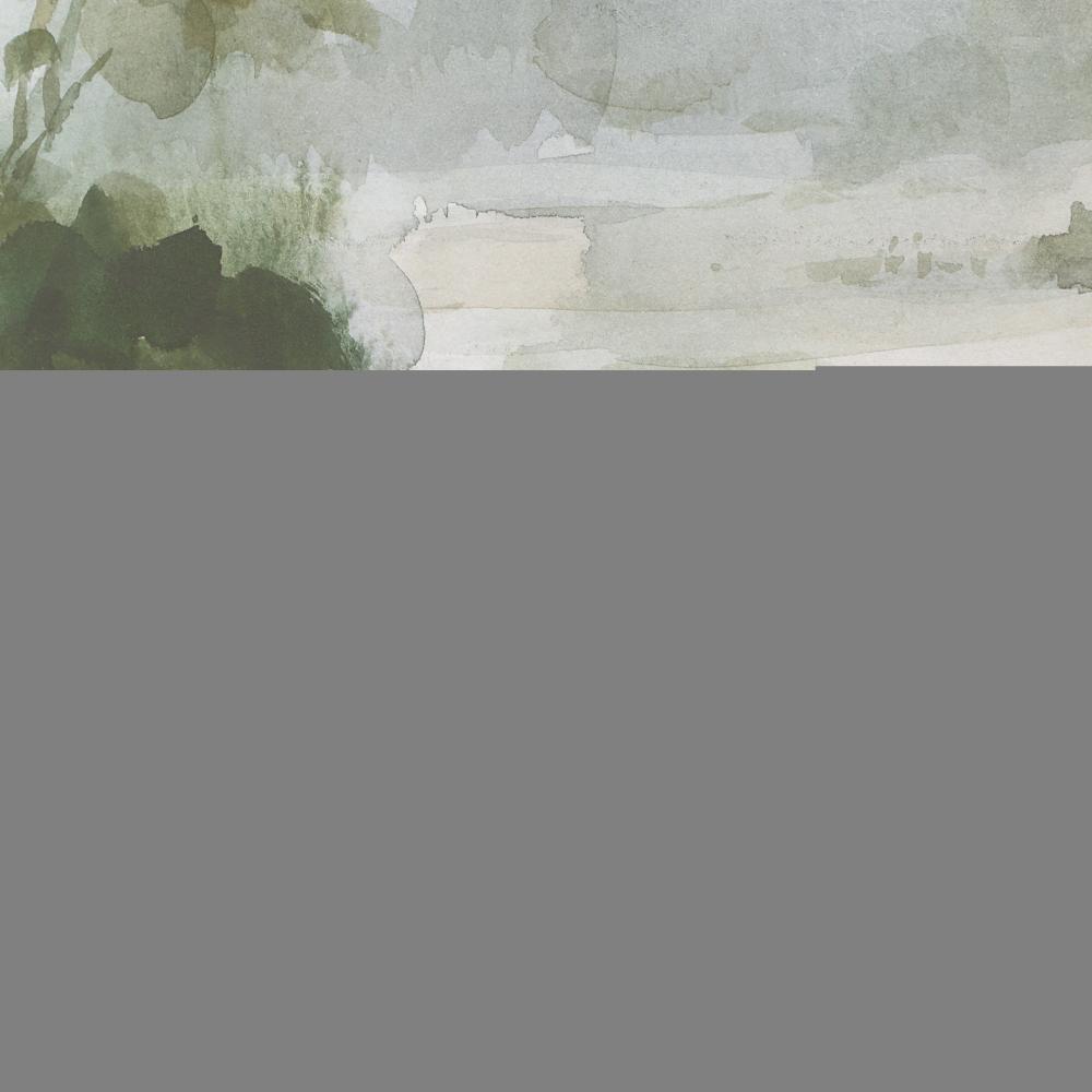 Wander Down The Path Of Verdant Framed Print. Showcasing A Lush Watercolor Landscape With Vibrant Green Hues. The Piece Is Surrounded By A Wood Frame In A Warm Light Oak Finish And Complemented By A Crisp White Double Mat Under Protective Glass. Artwork By Danhui Nai.