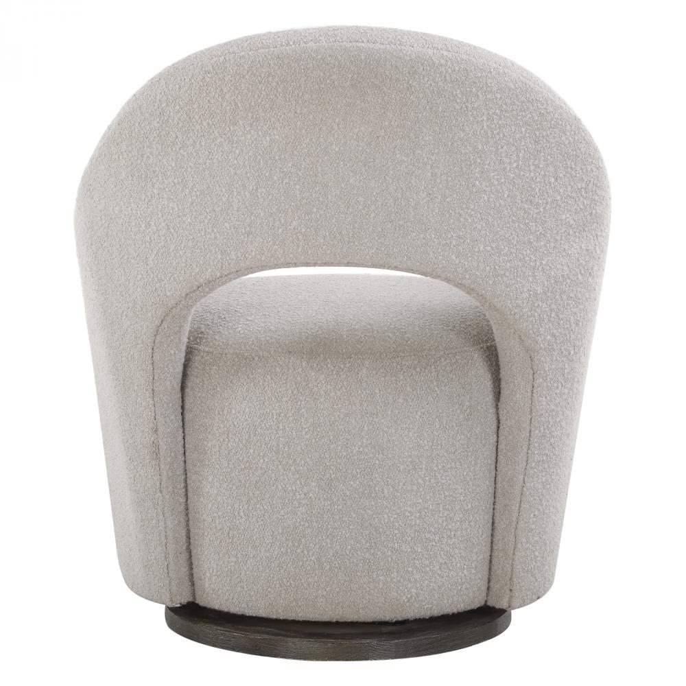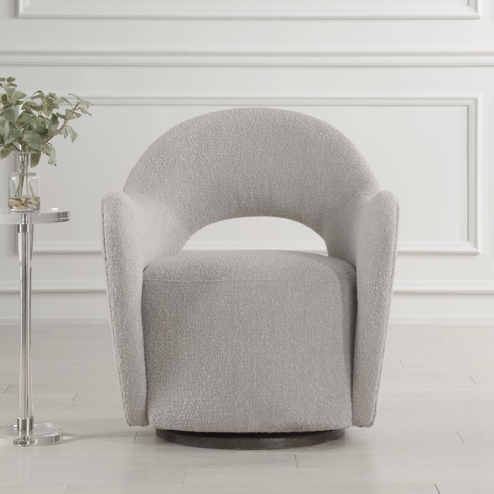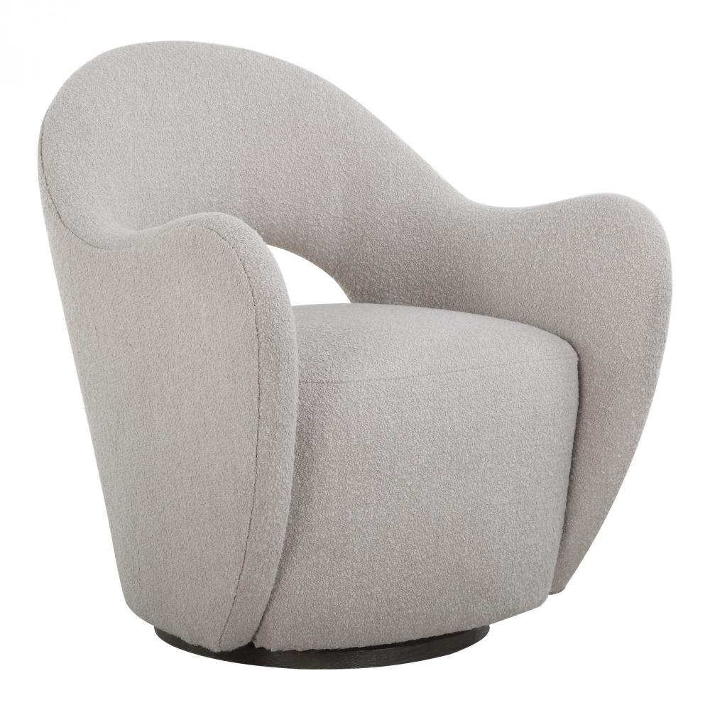 Gentle Curves And Fun Cutouts Give A Unexpected Twist In The Wander Swivel Chair. Upholstered In An Oat Toned Polyester Blend With Wool-like Texture, Resting Atop A