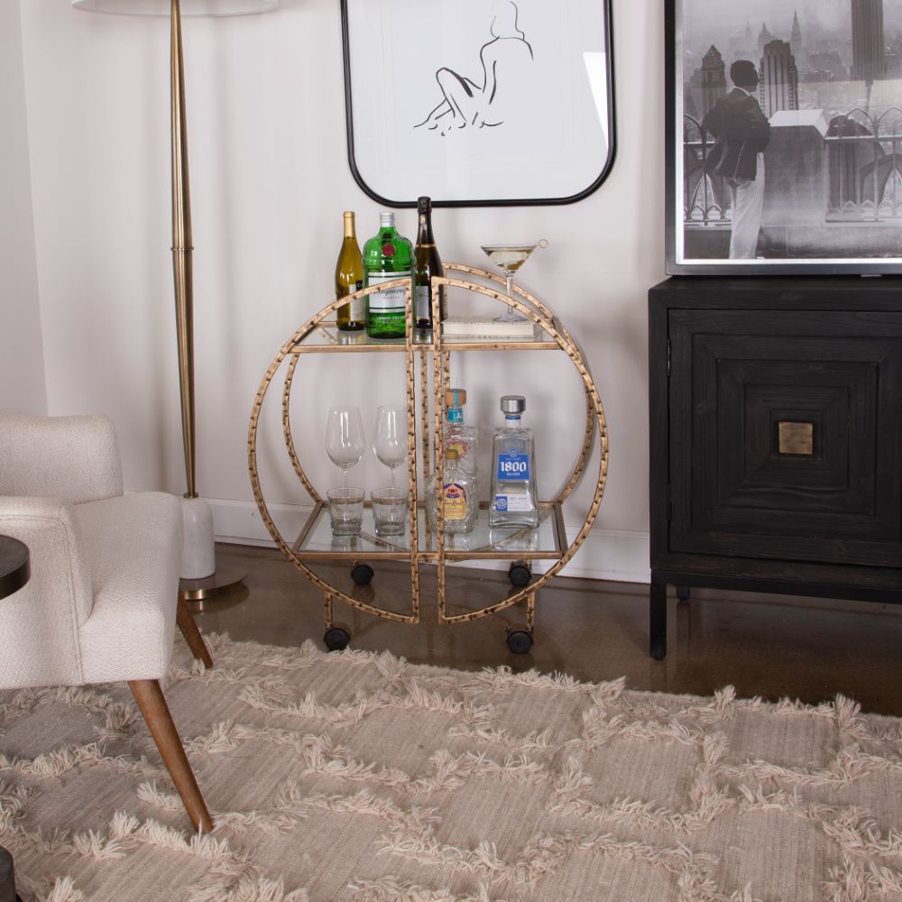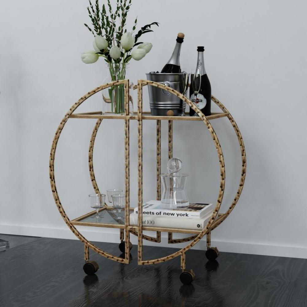 Featuring Hand Forged Iron with Hammered Texturing in A Heavily Antique Gold Finish, This Versatile Bar Cart Reaches Across Many Design Styles. Includes Two Clear Tempered Glass Shelves, Complete with Rolling Casters.