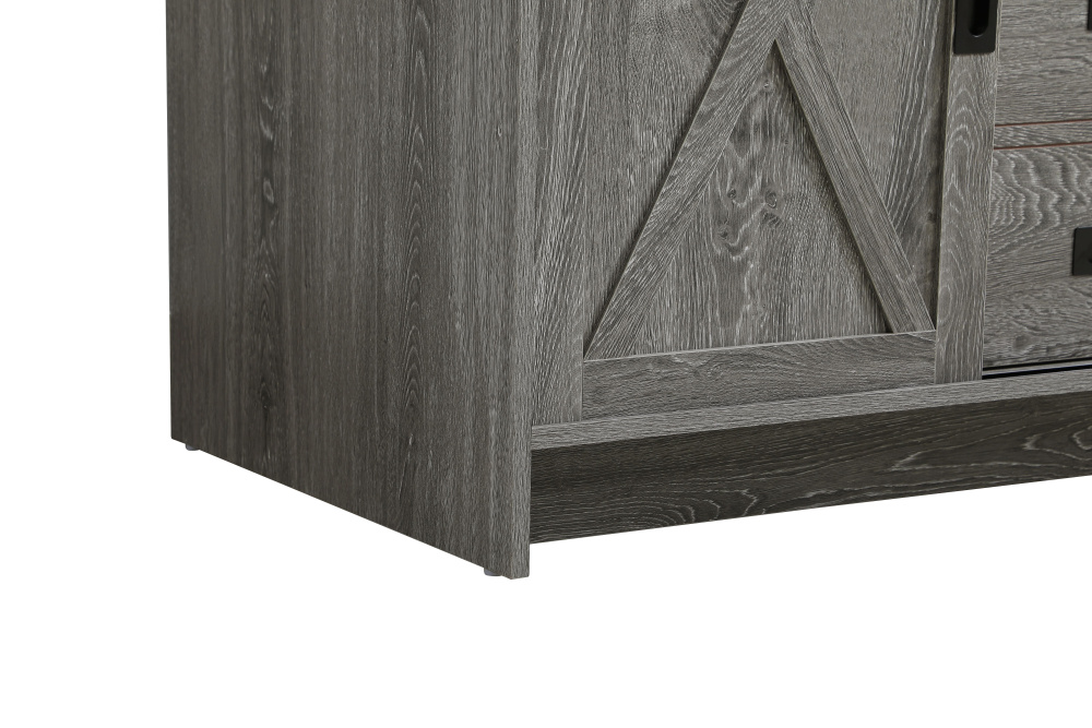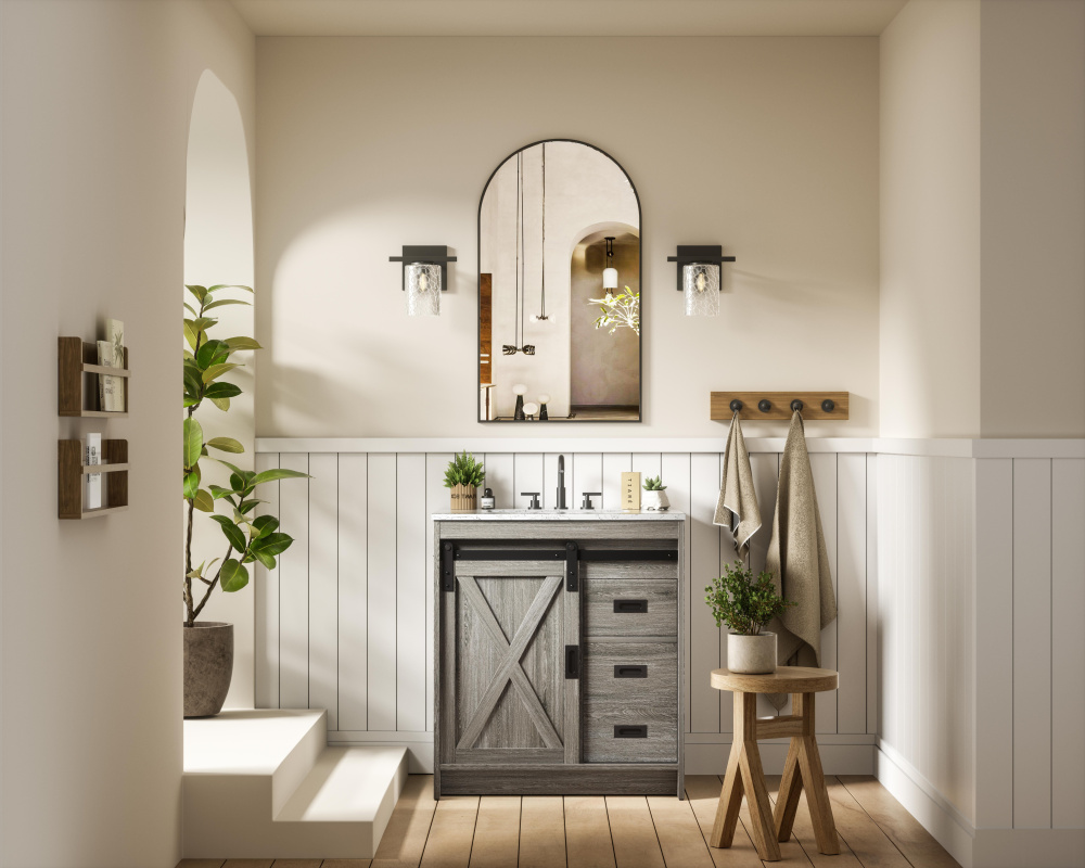 Features a unique sliding barn door with matte black metal hardware for a farmhouse-inspired aesthetic