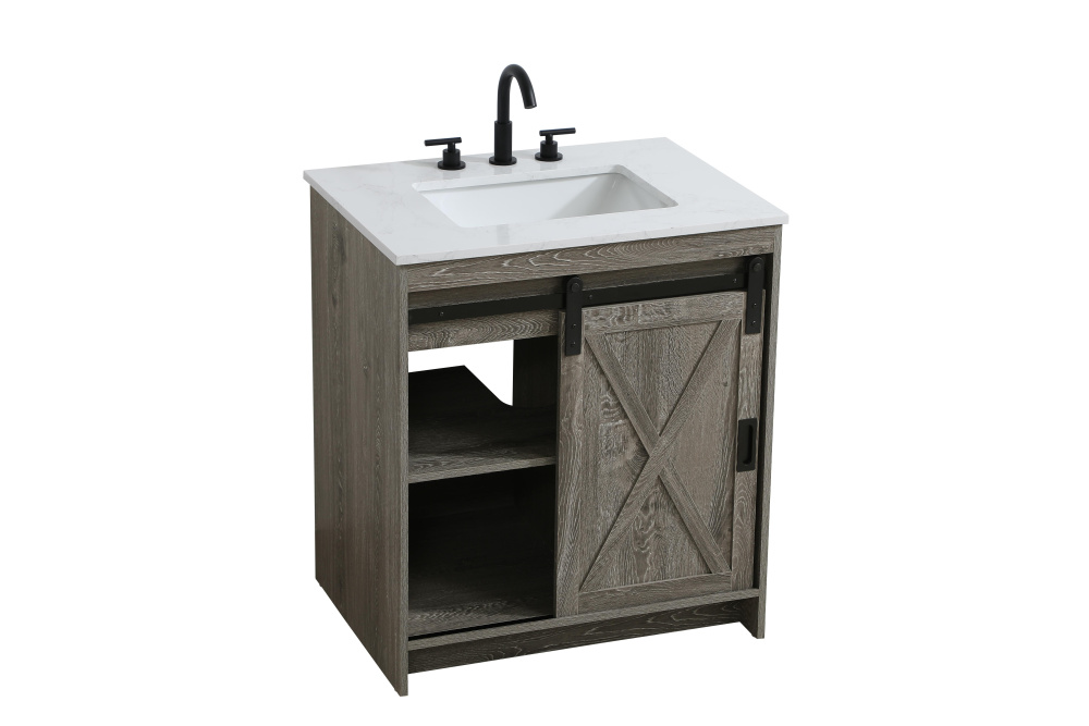 Transform your bathroom with this rustic barnyard-style vanity, designed to balance aesthetic appeal and functionality. Featuring a sliding barn door with black metal hardware and complementary handle pulls, this piece blends rugged charm with practical design. The engineered marble countertop displays unique marbling, while the porcelain undermount sink offers easy maintenance and durability. Available in Espresso, Natural Oak, and Rustic Grey finishes, this vanity suits a range of styles. It includes a deep storage drawer for larger items, a hidden shelf for towels or décor, and adjustable foot levelers for added stability on uneven floors. With pre-drilled faucet holes for easy setup, this vanity delivers style and substance to enhance your bathroom.