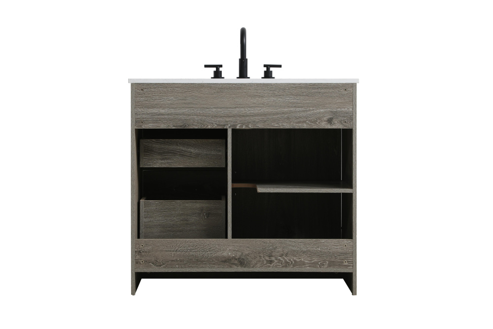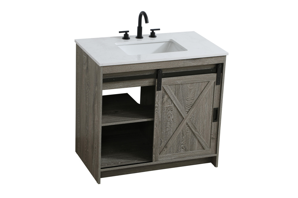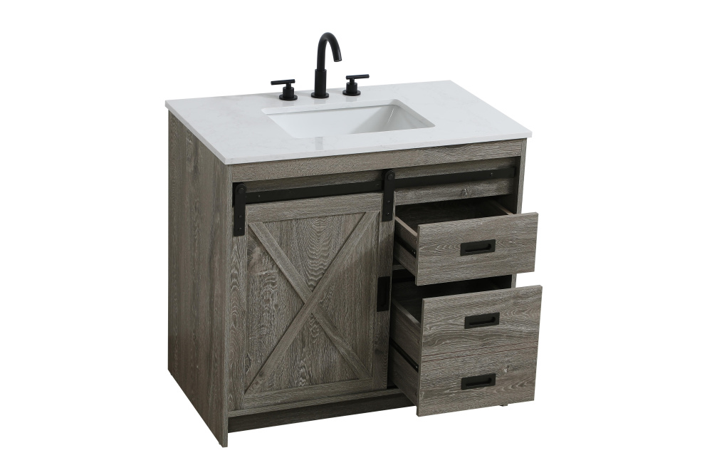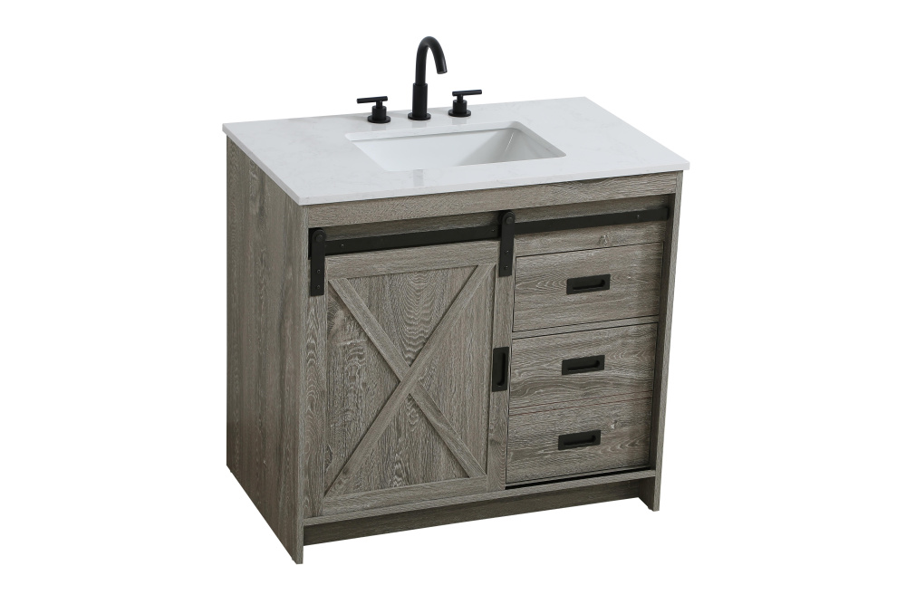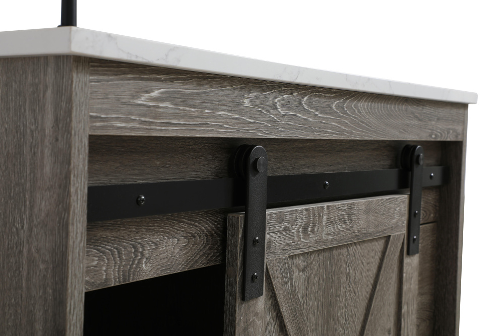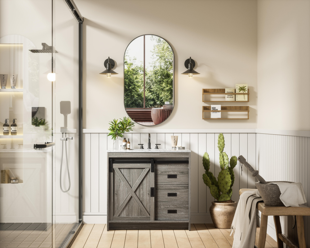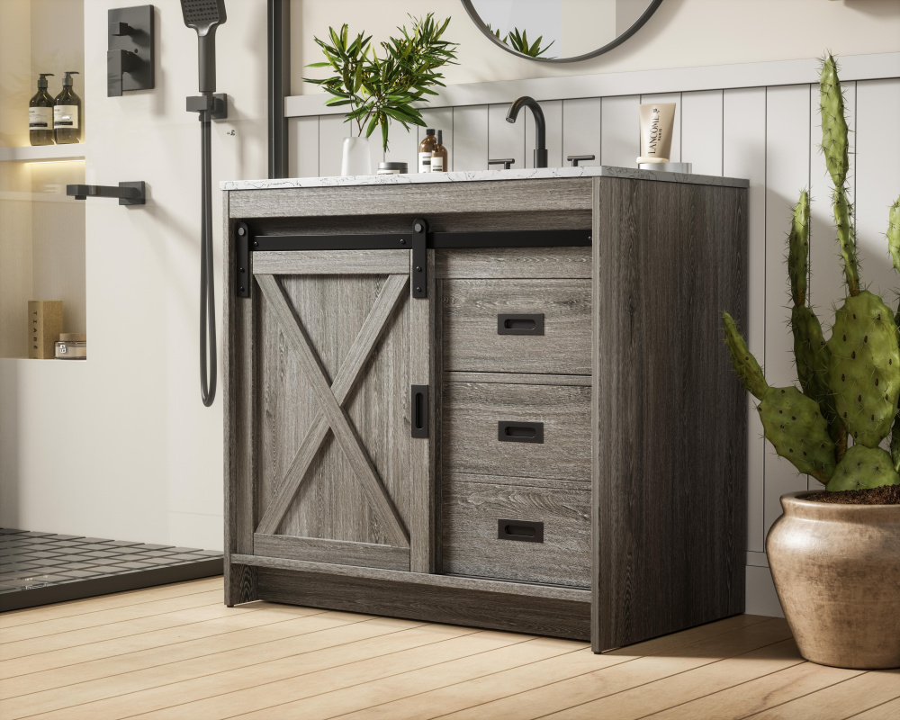 Transform your bathroom with this rustic barnyard-style vanity, designed to balance aesthetic appeal and functionality. Featuring a sliding barn door with black metal hardware and complementary handle pulls, this piece blends rugged charm with practical design. The engineered marble countertop displays unique marbling, while the porcelain undermount sink offers easy maintenance and durability. Available in Espresso, Natural Oak, and Rustic Grey finishes, this vanity suits a range of styles. It includes a deep storage drawer for larger items, a hidden shelf for towels or décor, and adjustable foot levelers for added stability on uneven floors. With pre-drilled faucet holes for easy setup, this vanity delivers style and substance to enhance your bathroom.