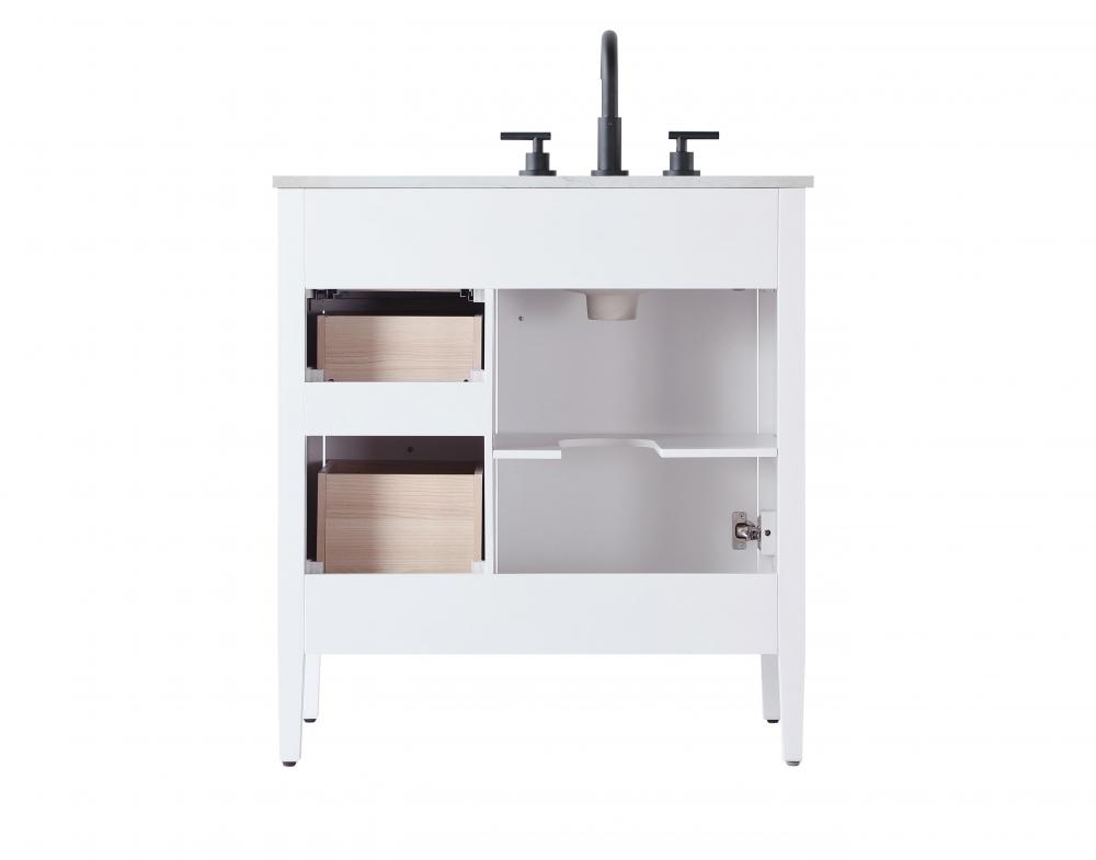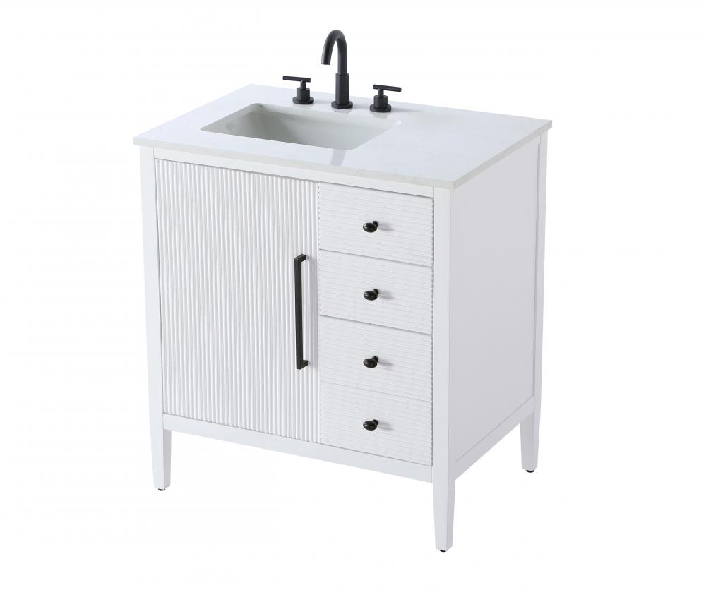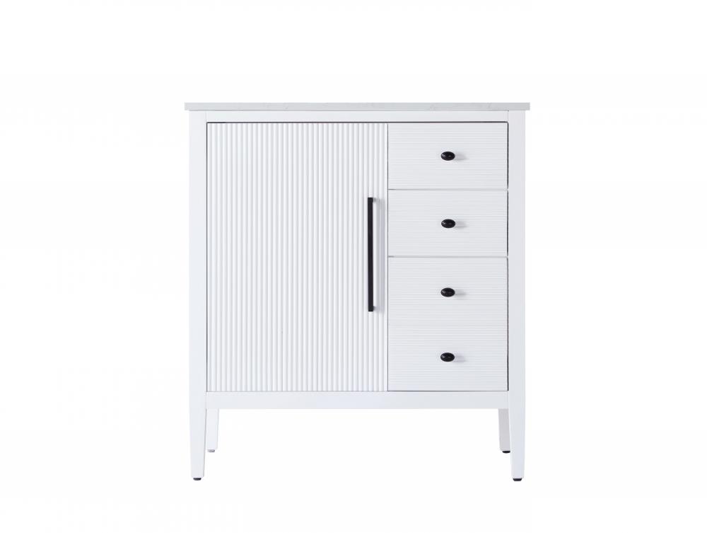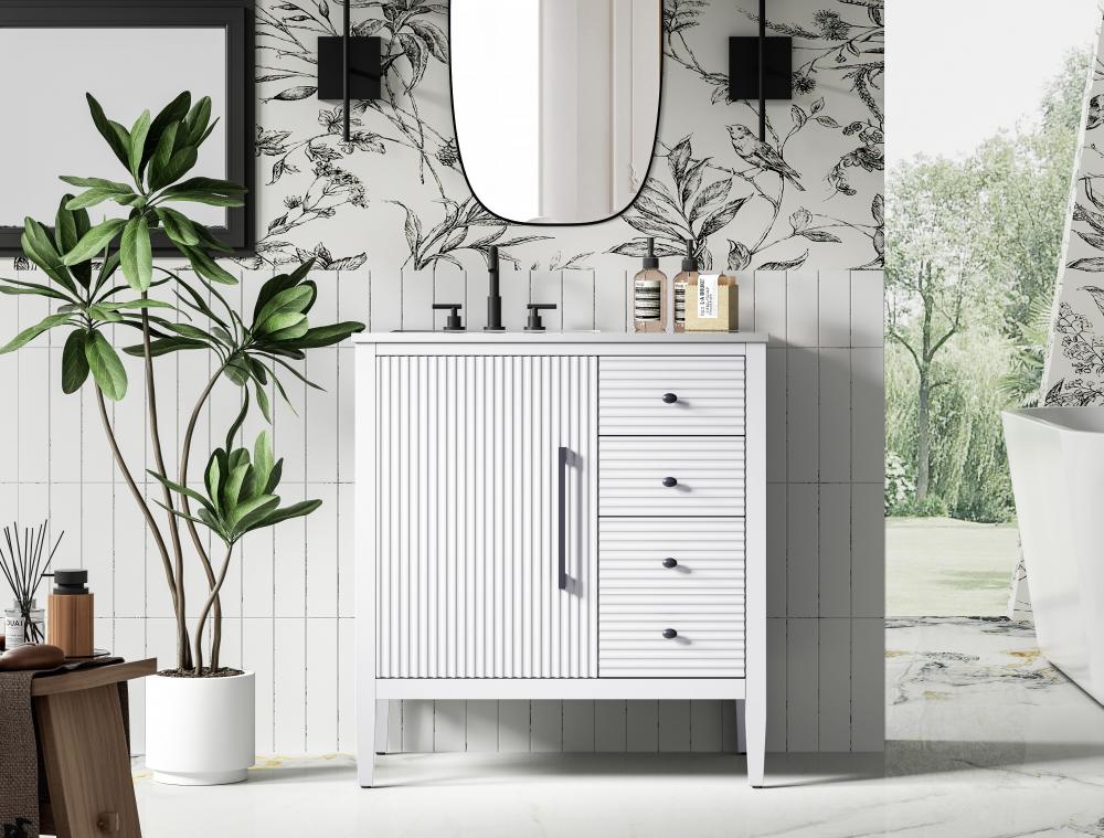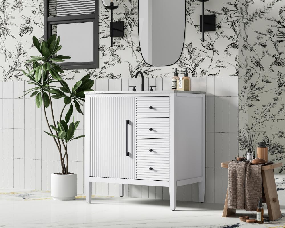 Designed with transitional elegance in mind, this bathroom vanity seamlessly blends traditional elements with modern functionality. Available in five stunning finishes, from the clean sophistication of Crisp White to the natural warmth of Honey Oak, the fluted door and drawer panels add subtle texture and charm. The white engineered marble countertop with natural veining exudes luxury, while the soft-closing doors and drawers with sleek black metal pulls offer a quiet, refined experience. Practicality is never compromised, with features like the U-shaped shelf for plumbing, deeper bottom drawer for ample storage, and pre-drilled faucet holes for easy customization. Whether your style leans modern or classic, this vanity is the perfect balance of beauty and function, appealing to customers with a taste for quality and style.