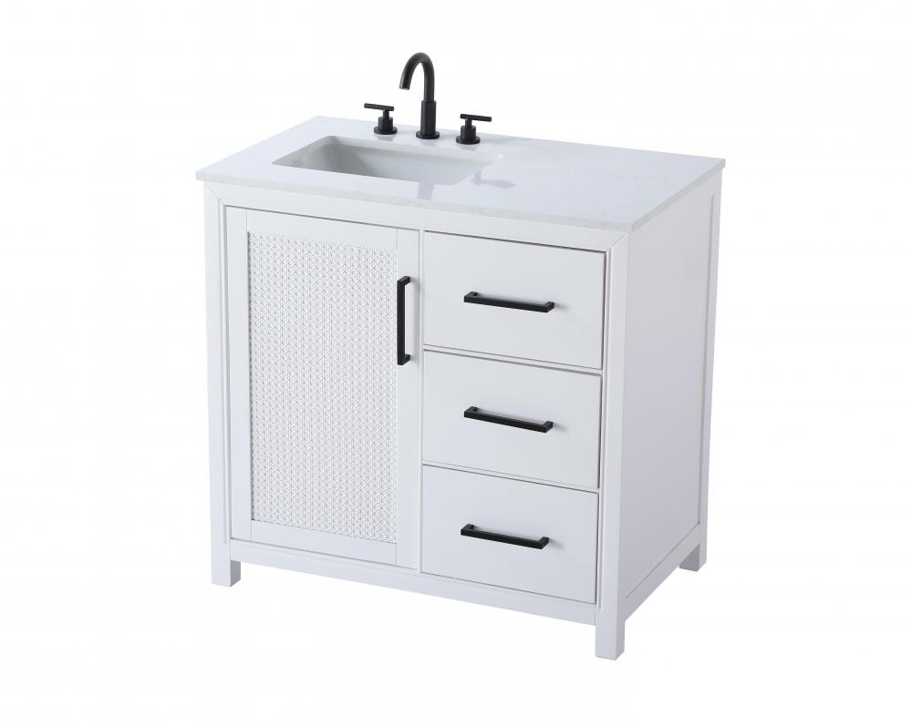 Perfect for those with an eye for detail and quality, this transitional vanity blends modern design with timeless elegance. Available in five stunning finishes, from Crisp White to Linen Oak, the wood grain visuals of the oak options bring warmth and character to any bathroom. The caning design on the Shaker-style door panels adds texture and a touch of refinement, while the soft-closing doors and drawers ensure smooth, quiet functionality. Topped with a white engineered marble countertop, the vanity offers both luxury and practicality, complete with pre-drilled faucet holes for customization. A concealed overflow and U-shaped shelf for plumbing make installation effortless, and the slender black metal pulls provide a sleek contrast.