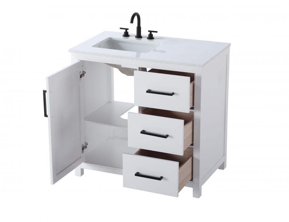 The slender black metal handle pulls on the doors and drawers offer a sleek, modern contrast to the white finish, adding to the vanity's sophisticated look.