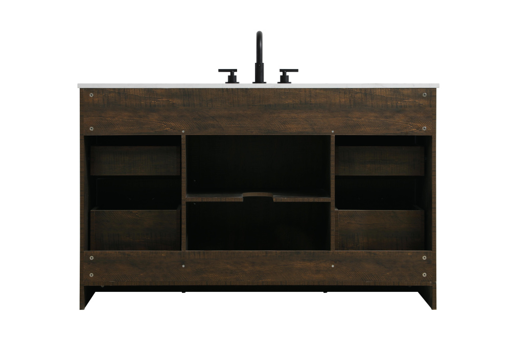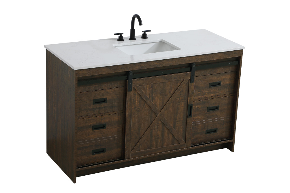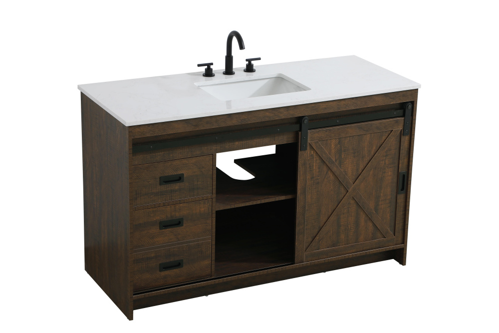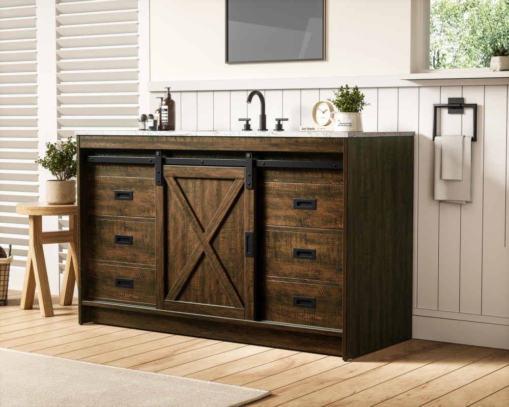Transform your bathroom with this rustic barnyard-style vanity, designed to balance aesthetic appeal and functionality. Featuring a sliding barn door with black metal hardware and complementary handle pulls, this piece blends rugged charm with practical design. The engineered marble countertop displays unique marbling, while the porcelain undermount sink offers easy maintenance and durability. Available in Espresso, Natural Oak, and Rustic Grey finishes, this vanity suits a range of styles. It includes a deep storage drawer for larger items, a hidden shelf for towels or décor, and adjustable foot levelers for added stability on uneven floors. With pre-drilled faucet holes for easy setup, this vanity delivers style and substance to enhance your bathroom.