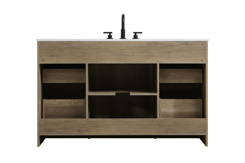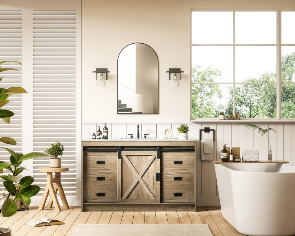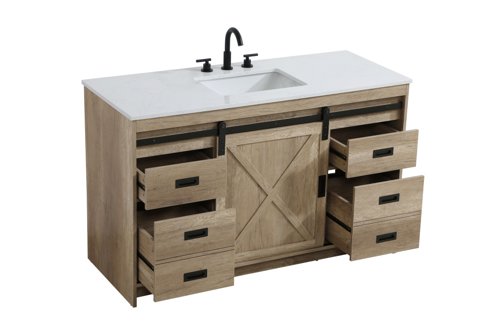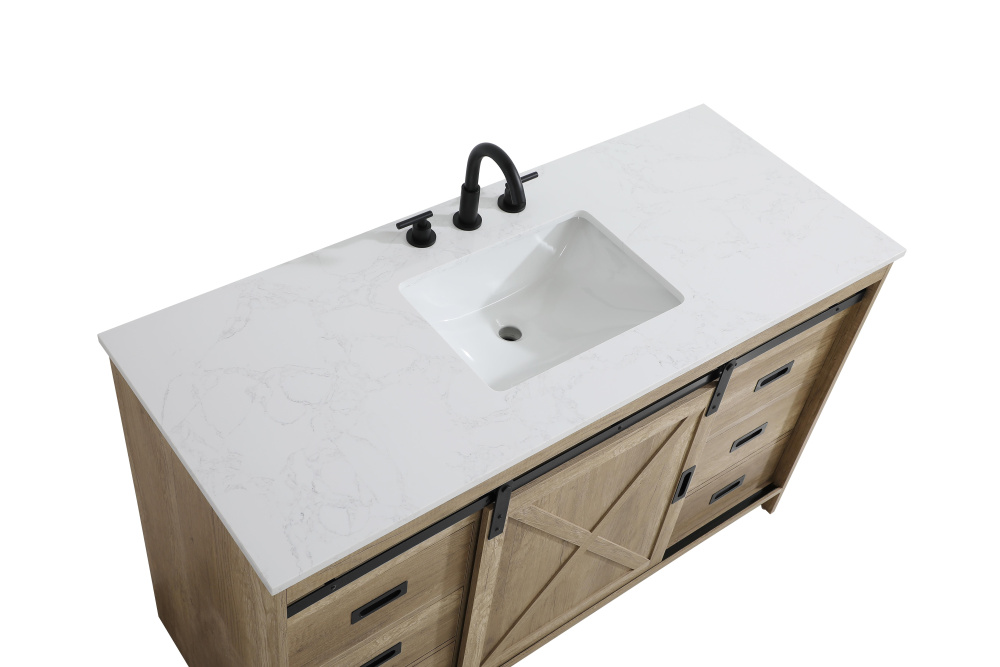 Transform your bathroom with this rustic barnyard-style vanity, designed to balance aesthetic appeal and functionality. Featuring a sliding barn door with black metal hardware and complementary handle pulls, this piece blends rugged charm with practical design. The engineered marble countertop displays unique marbling, while the porcelain undermount sink offers easy maintenance and durability. Available in Espresso, Natural Oak, and Rustic Grey finishes, this vanity suits a range of styles. It includes a deep storage drawer for larger items, a hidden shelf for towels or décor, and adjustable foot levelers for added stability on uneven floors. With pre-drilled faucet holes for easy setup, this vanity delivers style and substance to enhance your bathroom.