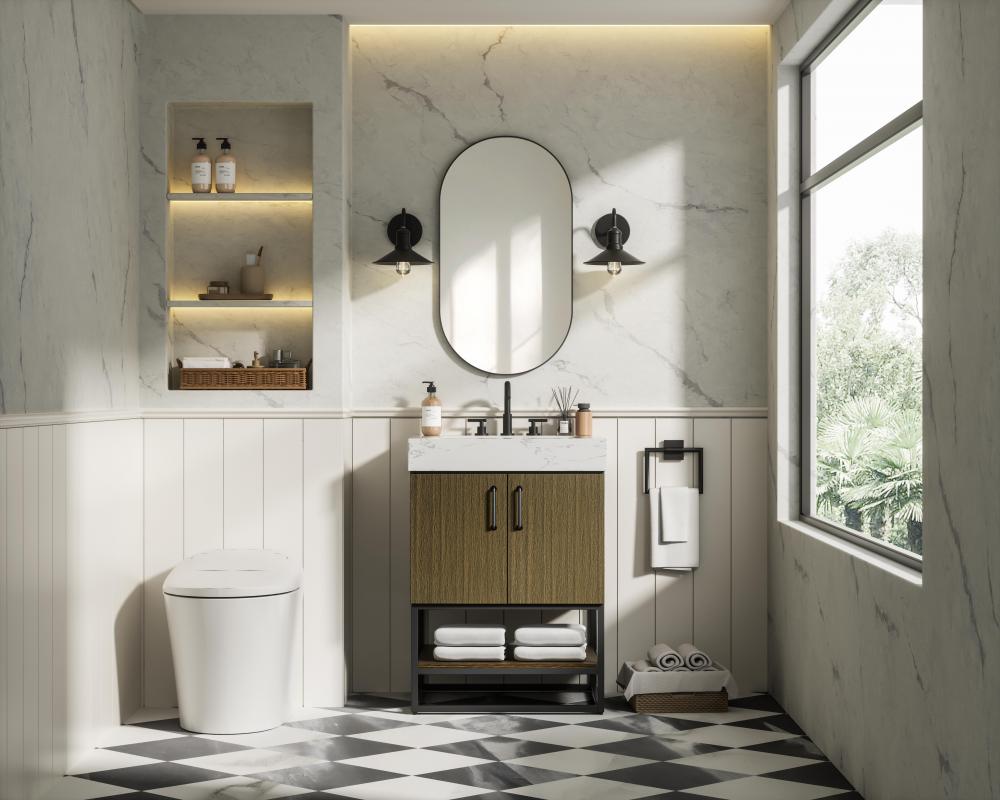 Flat panel designs create a minimalist and modern look, giving the vanity clean lines while maintaining a subtle, farmhouse-inspired charm.