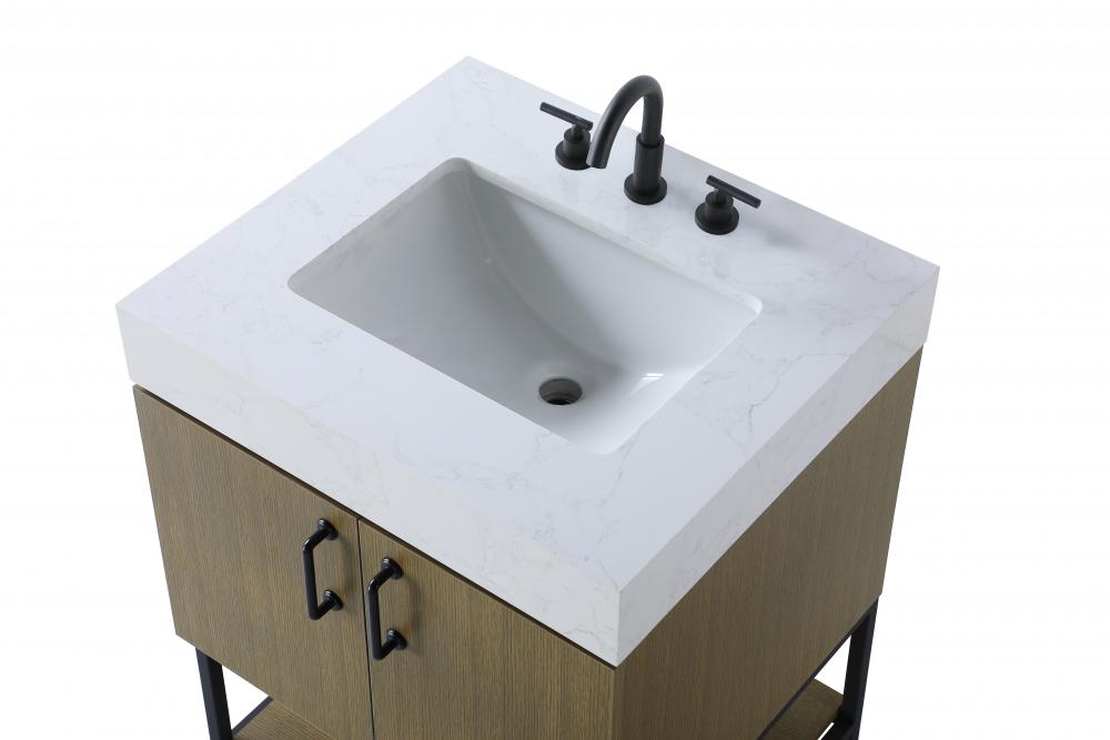 Upgrade your bathroom with this stylish transitional vanity, available in five stunning finishes, from crisp white to warm honey brown, designed to suit a variety of decor styles. The minimalist flat door panels and open wood shelf create a functional yet visually appealing storage solution, while the slender black metal legs elevate the look with modern sophistication. The 4-inch thick white engineered marble countertop, accented with natural veining, adds a luxurious touch, perfectly complemented by soft-closing doors with sleek black metal bar pulls. Thoughtful details like the concealed overflow, back panel cutout for plumbing, and 3 pre-drilled holes for an 8-inch faucet make installation easy and efficient. with a porcelain sink and farmhouse-inspired touches, this vanity brings both elegance and practicality to any bathroom setting.