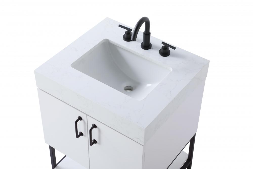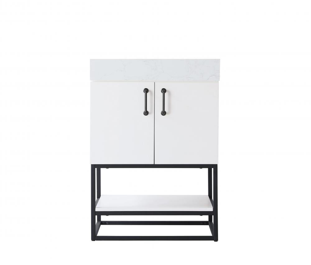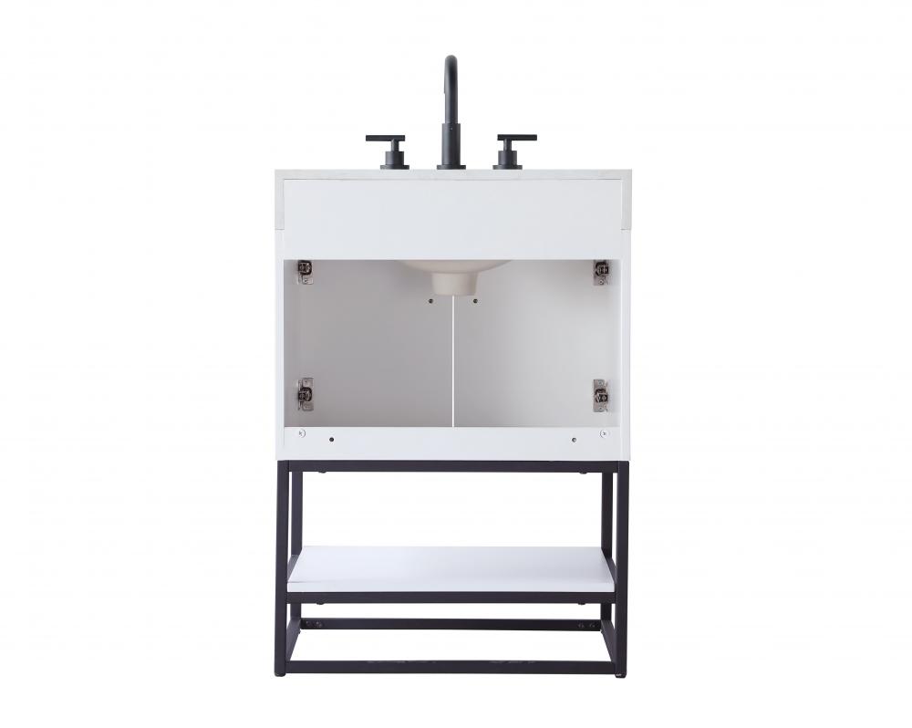 Upgrade your bathroom with this stylish transitional vanity, available in five stunning finishes, from crisp white to warm honey brown, designed to suit a variety of decor styles. The minimalist flat door panels and open wood shelf create a functional yet visually appealing storage solution, while the slender black metal legs elevate the look with modern sophistication. The 4-inch thick white engineered marble countertop, accented with natural veining, adds a luxurious touch, perfectly complemented by soft-closing doors with sleek black metal bar pulls. Thoughtful details like the concealed overflow, back panel cutout for plumbing, and 3 pre-drilled holes for an 8-inch faucet make installation easy and efficient. with a porcelain sink and farmhouse-inspired touches, this vanity brings both elegance and practicality to any bathroom setting.