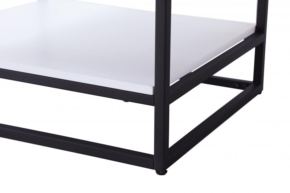 A matching open wood shelf at the bottom provides ample space for storage and decor, supported by slender black metal legs with a 14-inch clearance, combining both practical function and a contemporary edge.