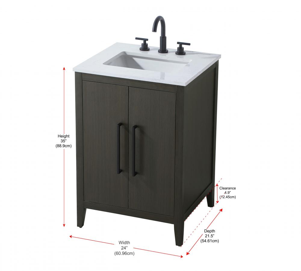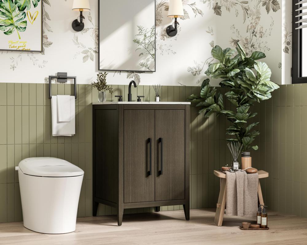 Bring both elegance and practicality to your bathroom with this transitional vanity, available in a selection of rich finishes that highlight the beauty of faux wood grain in shades of mocha, chestnut, and honey, along with classic white and modern grey. The flat door panels and sleek black metal pulls create a minimalist yet refined aesthetic, while the soft-closing drawers and tapered legs with levelers provide smooth, functional operation. Topped with a luxurious white engineered marble countertop and featuring a porcelain sink, this vanity combines timeless style with modern efficiency. Thoughtfully designed with U-shaped cutout for plumbing, it offers ample storage and easy installation, making it the perfect centerpiece for any bathroom.