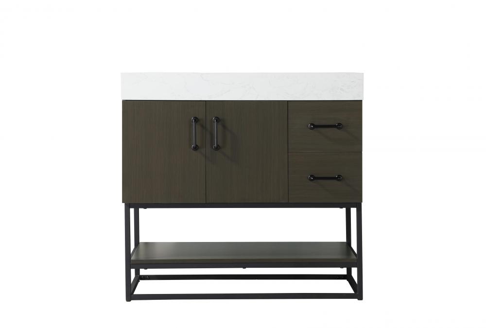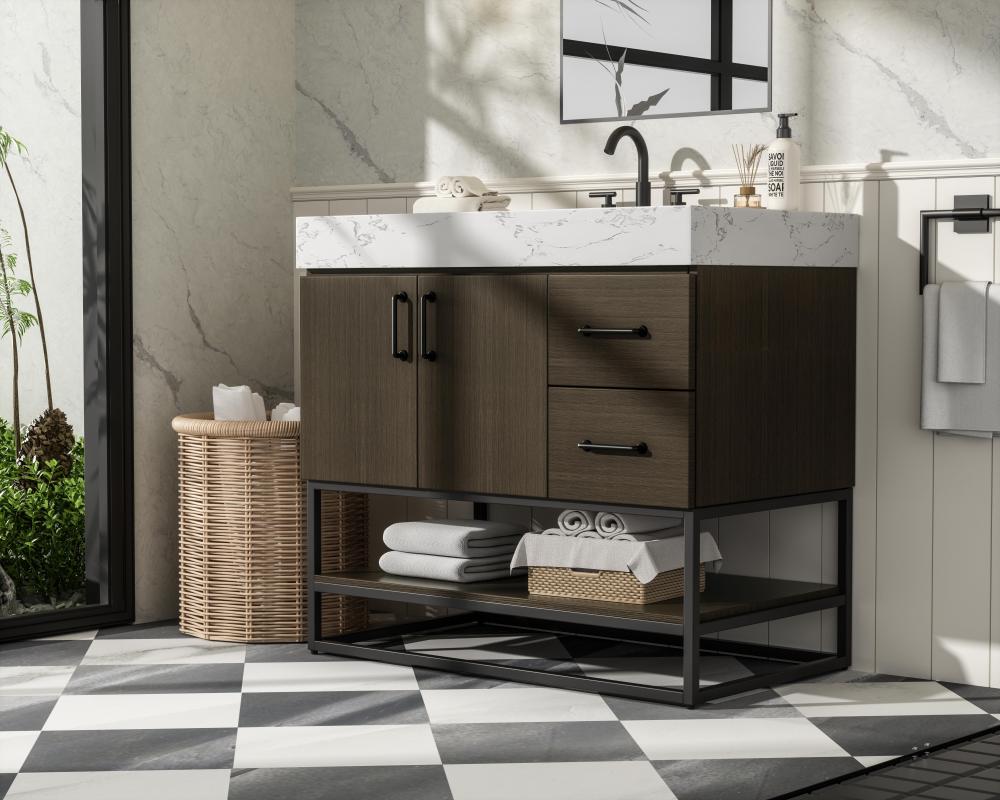 Upgrade your bathroom with this stylish transitional vanity, available in five stunning finishes, from crisp white to warm honey brown, designed to suit a variety of decor styles. The minimalist flat door panels and open wood shelf create a functional yet visually appealing storage solution, while the slender black metal legs elevate the look with modern sophistication. The 4-inch thick white engineered marble countertop, accented with natural veining, adds a luxurious touch, perfectly complemented by soft-closing doors with sleek black metal bar pulls. Thoughtful details like the concealed overflow, back panel cutout for plumbing, and 3 pre-drilled holes for an 8-inch faucet make installation easy and efficient. with a porcelain sink and farmhouse-inspired touches, this vanity brings both elegance and practicality to any bathroom setting.
