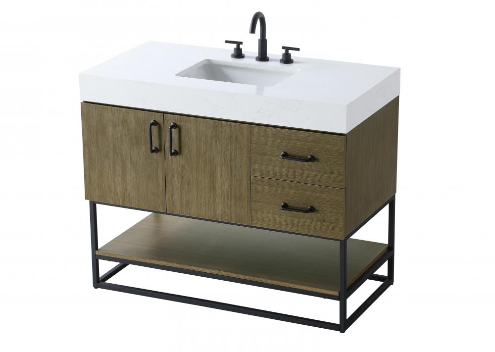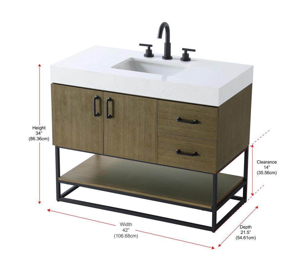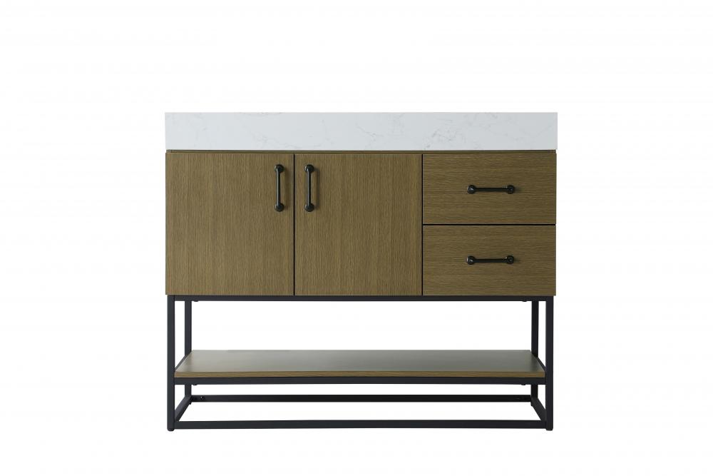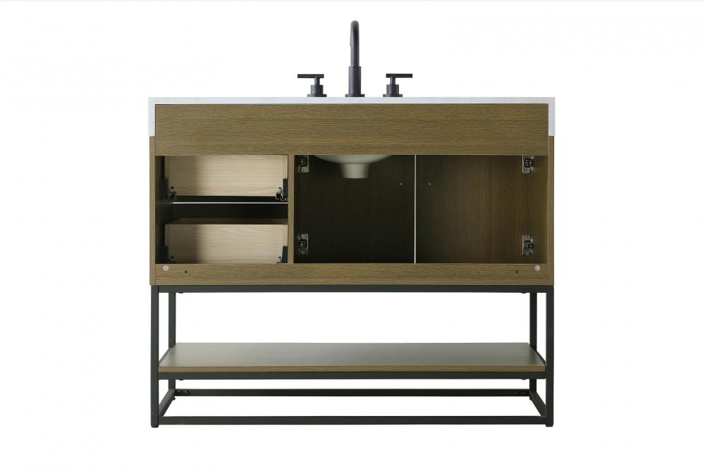 Upgrade your bathroom with this stylish transitional vanity, available in five stunning finishes, from crisp white to warm honey brown, designed to suit a variety of decor styles. The minimalist flat door panels and open wood shelf create a functional yet visually appealing storage solution, while the slender black metal legs elevate the look with modern sophistication. The 4-inch thick white engineered marble countertop, accented with natural veining, adds a luxurious touch, perfectly complemented by soft-closing doors with sleek black metal bar pulls. Thoughtful details like the concealed overflow, back panel cutout for plumbing, and 3 pre-drilled holes for an 8-inch faucet make installation easy and efficient. with a porcelain sink and farmhouse-inspired touches, this vanity brings both elegance and practicality to any bathroom setting.