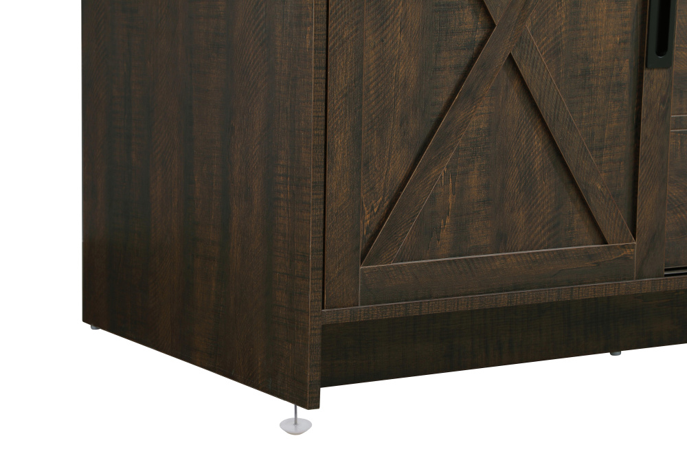 Features two unique sliding barn doors with black metal hardware for a farmhouse-inspired aesthetic
