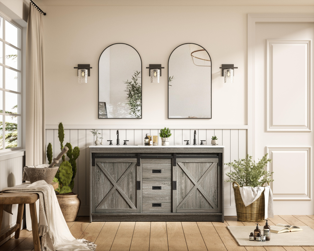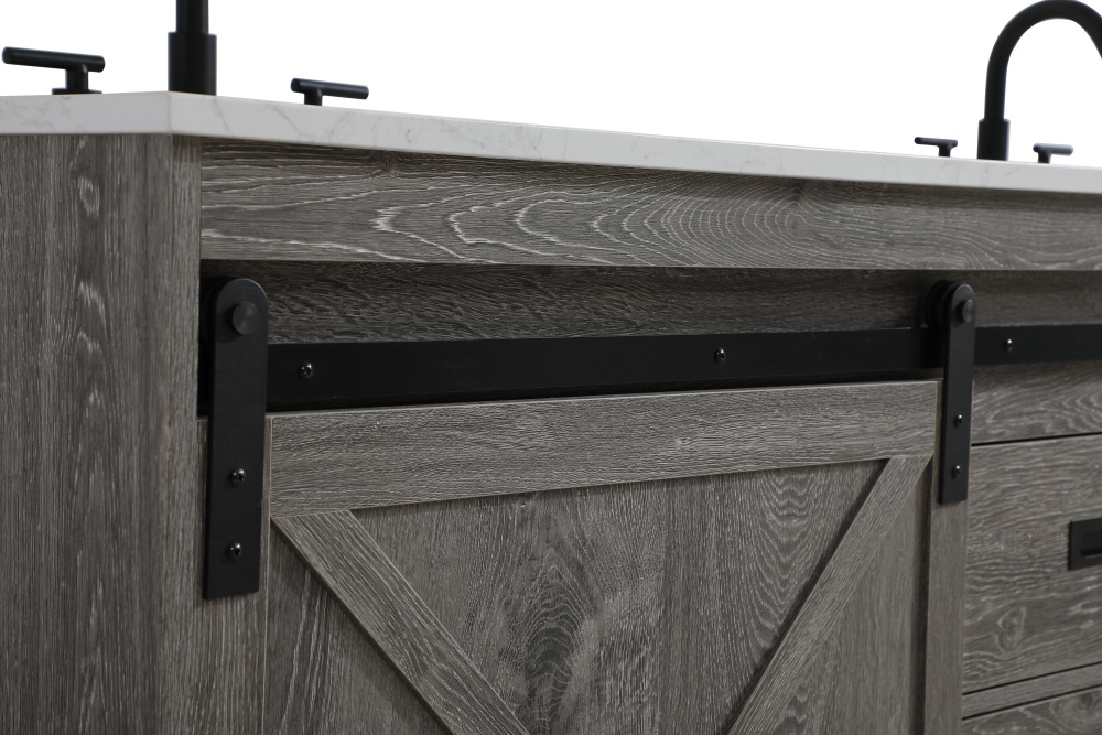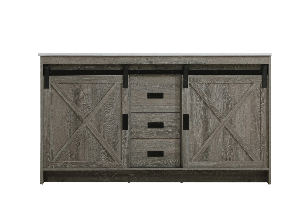 Transform your bathroom with this rustic barnyard-style vanity, designed to balance aesthetic appeal and functionality. Featuring a sliding barn door with black metal hardware and complementary handle pulls, this piece blends rugged charm with practical design. The engineered marble countertop displays unique marbling, while the porcelain undermount sink offers easy maintenance and durability. Available in Espresso, Natural Oak, and Rustic Grey finishes, this vanity suits a range of styles. It includes a deep storage drawer for larger items, a hidden shelf for towels or décor, and adjustable foot levelers for added stability on uneven floors. With pre-drilled faucet holes for easy setup, this vanity delivers style and substance to enhance your bathroom.