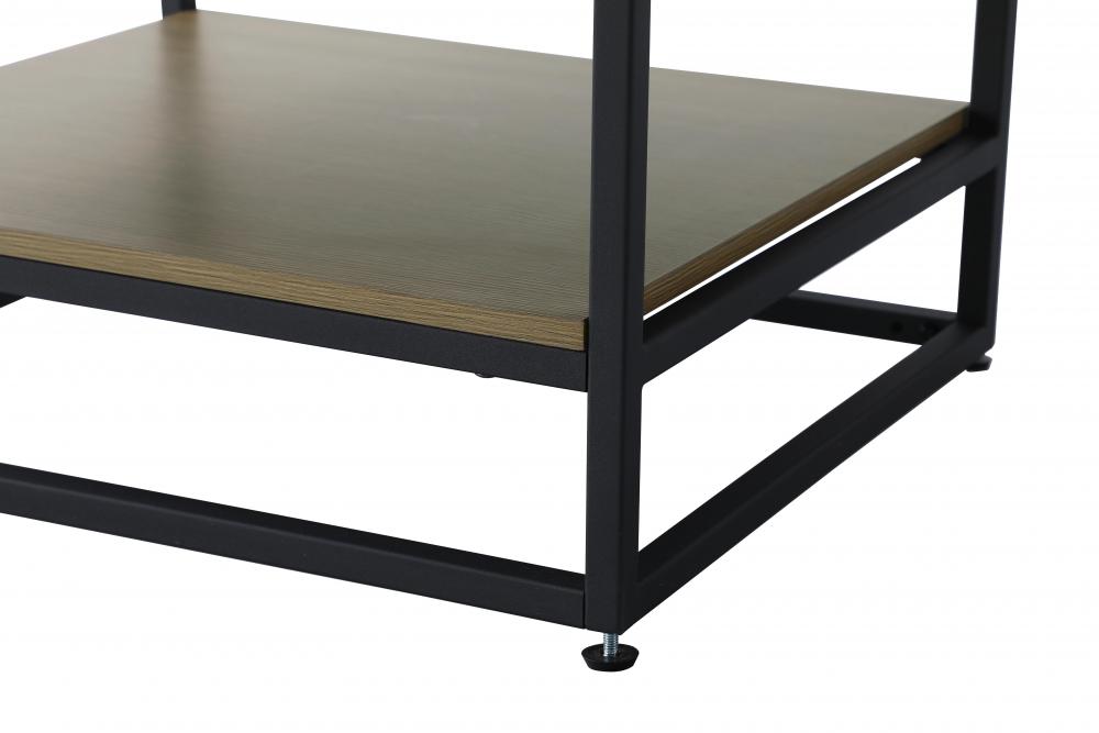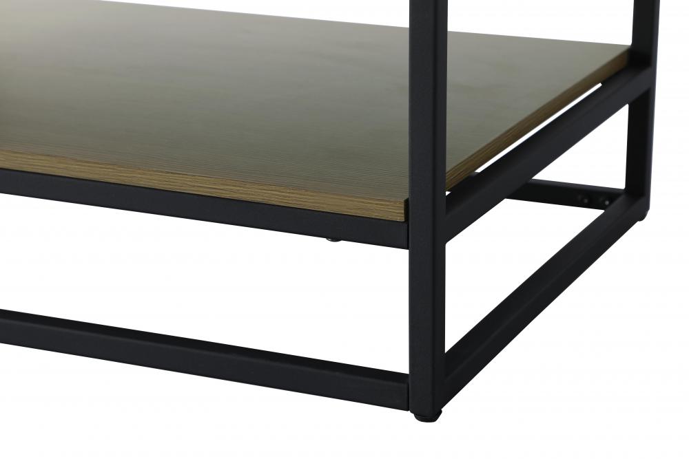 A matching open wood shelf at the bottom provides ample space for storage and decor, supported by slender black metal legs with a 14-inch clearance, combining both practical function and a contemporary edge.
