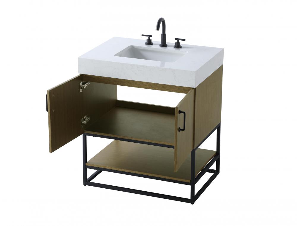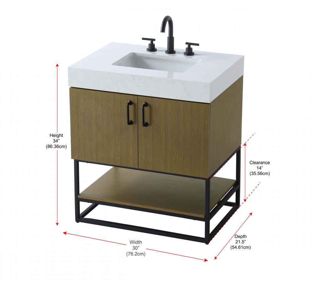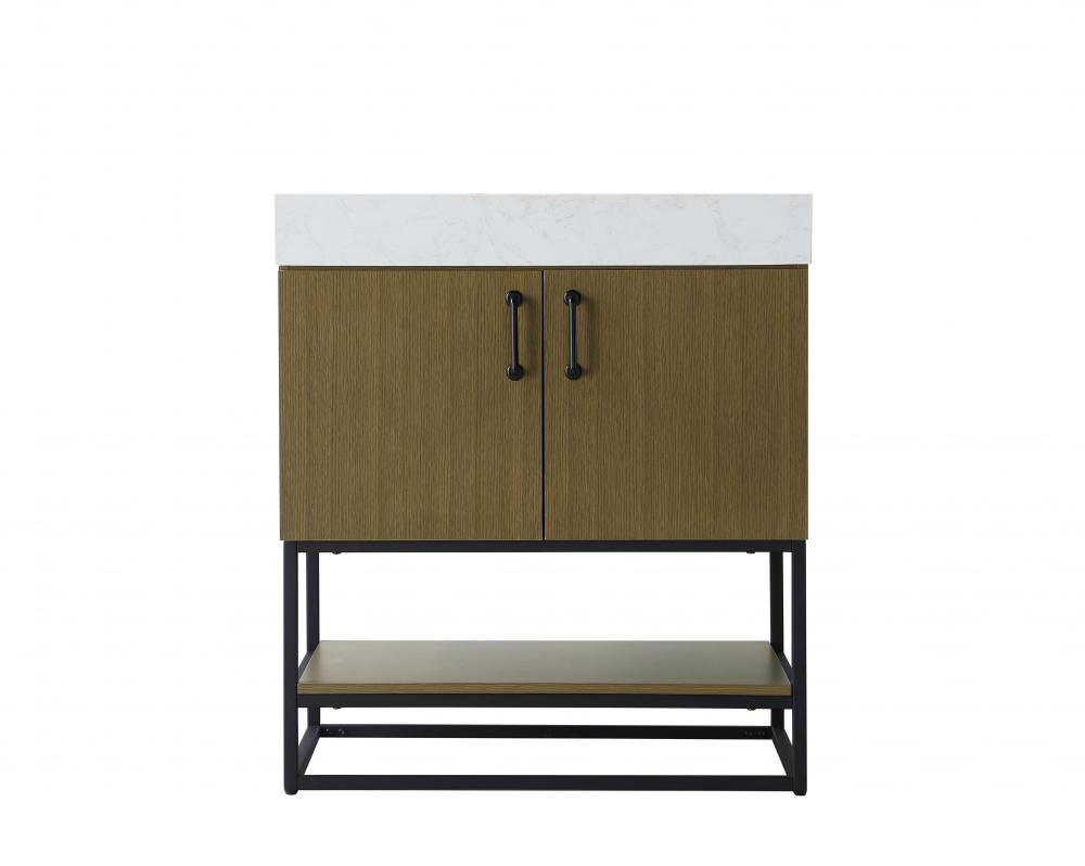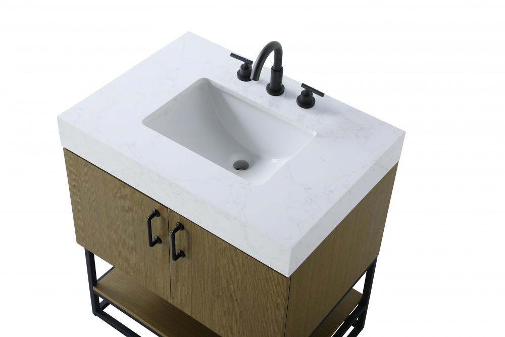 Upgrade your bathroom with this stylish transitional vanity, available in five stunning finishes, from crisp white to warm honey brown, designed to suit a variety of decor styles. The minimalist flat door panels and open wood shelf create a functional yet visually appealing storage solution, while the slender black metal legs elevate the look with modern sophistication. The 4-inch thick white engineered marble countertop, accented with natural veining, adds a luxurious touch, perfectly complemented by soft-closing doors with sleek black metal bar pulls. Thoughtful details like the concealed overflow, back panel cutout for plumbing, and 3 pre-drilled holes for an 8-inch faucet make installation easy and efficient. with a porcelain sink and farmhouse-inspired touches, this vanity brings both elegance and practicality to any bathroom setting.