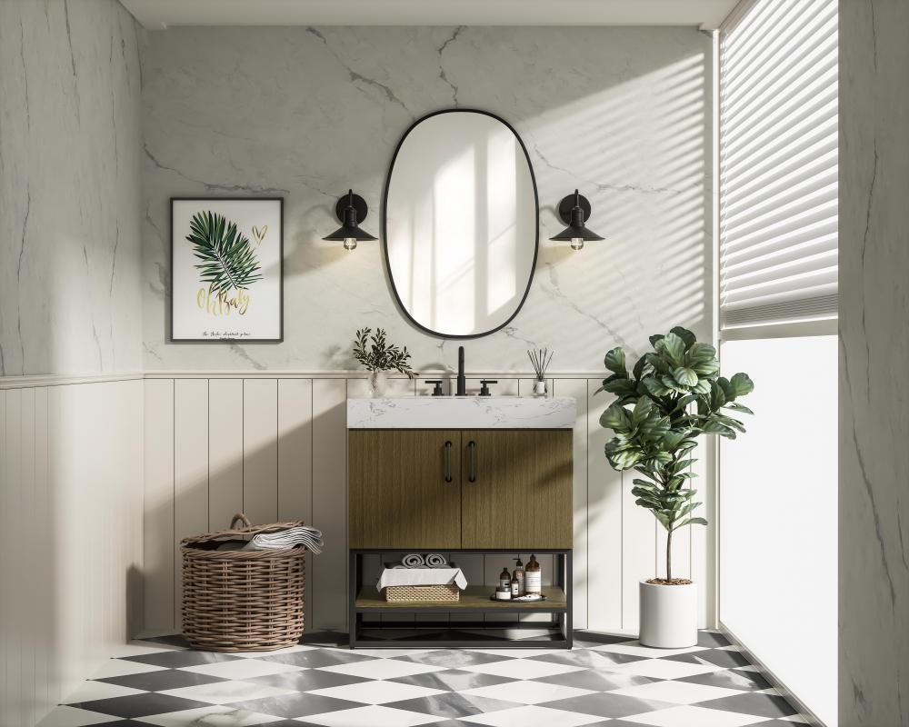 Flat panel designs create a minimalist and modern look, giving the vanity clean lines while maintaining a subtle, farmhouse-inspired charm.