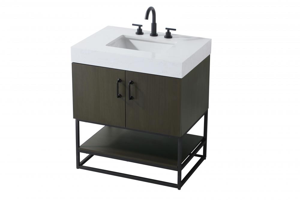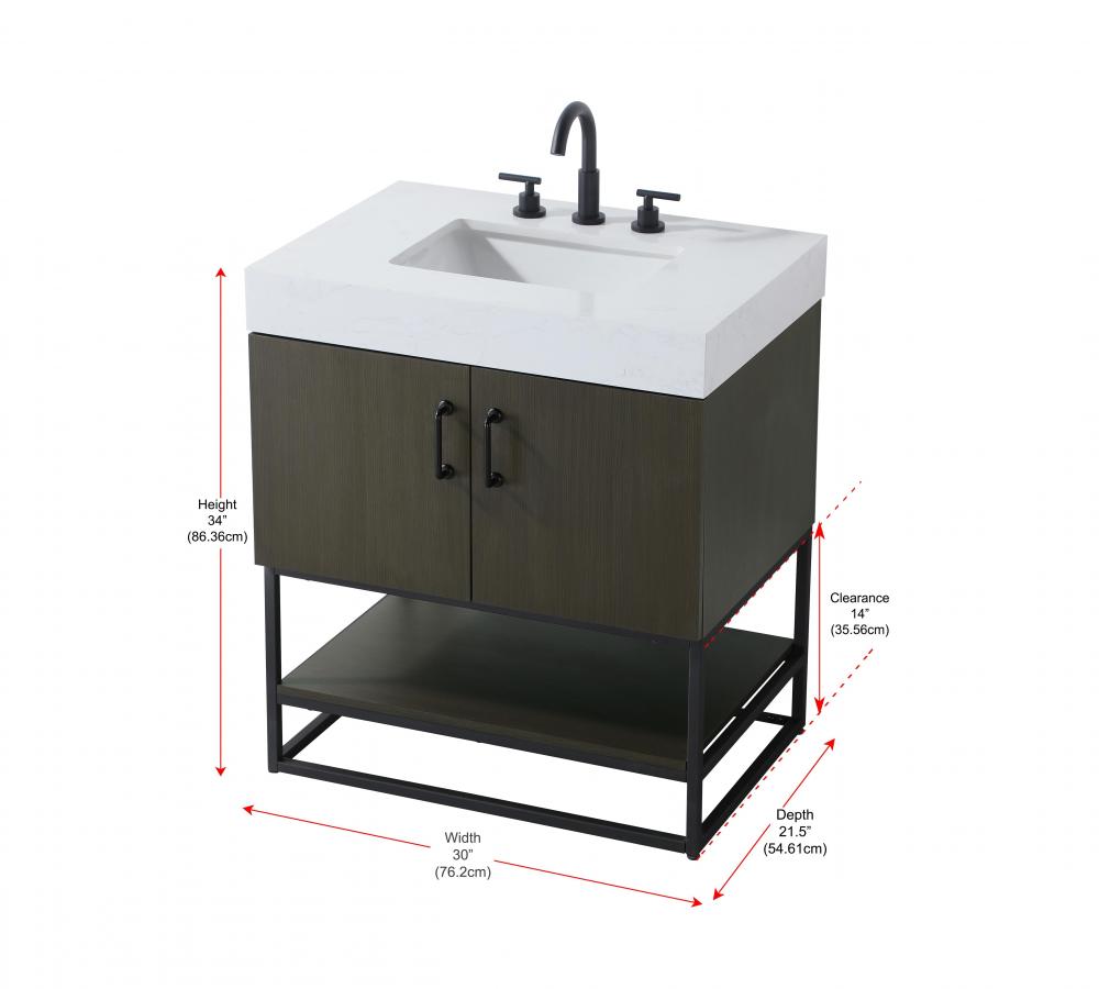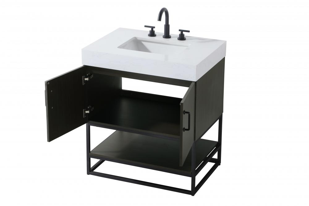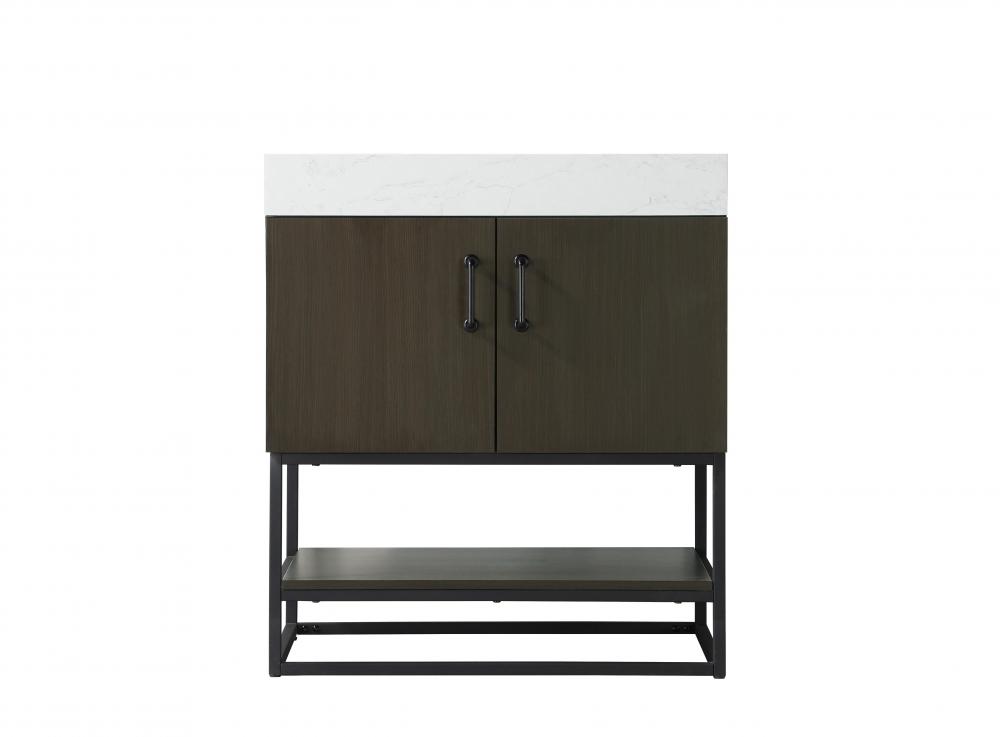 Upgrade your bathroom with this stylish transitional vanity, available in five stunning finishes, from crisp white to warm honey brown, designed to suit a variety of decor styles. The minimalist flat door panels and open wood shelf create a functional yet visually appealing storage solution, while the slender black metal legs elevate the look with modern sophistication. The 4-inch thick white engineered marble countertop, accented with natural veining, adds a luxurious touch, perfectly complemented by soft-closing doors with sleek black metal bar pulls. Thoughtful details like the concealed overflow, back panel cutout for plumbing, and 3 pre-drilled holes for an 8-inch faucet make installation easy and efficient. with a porcelain sink and farmhouse-inspired touches, this vanity brings both elegance and practicality to any bathroom setting.