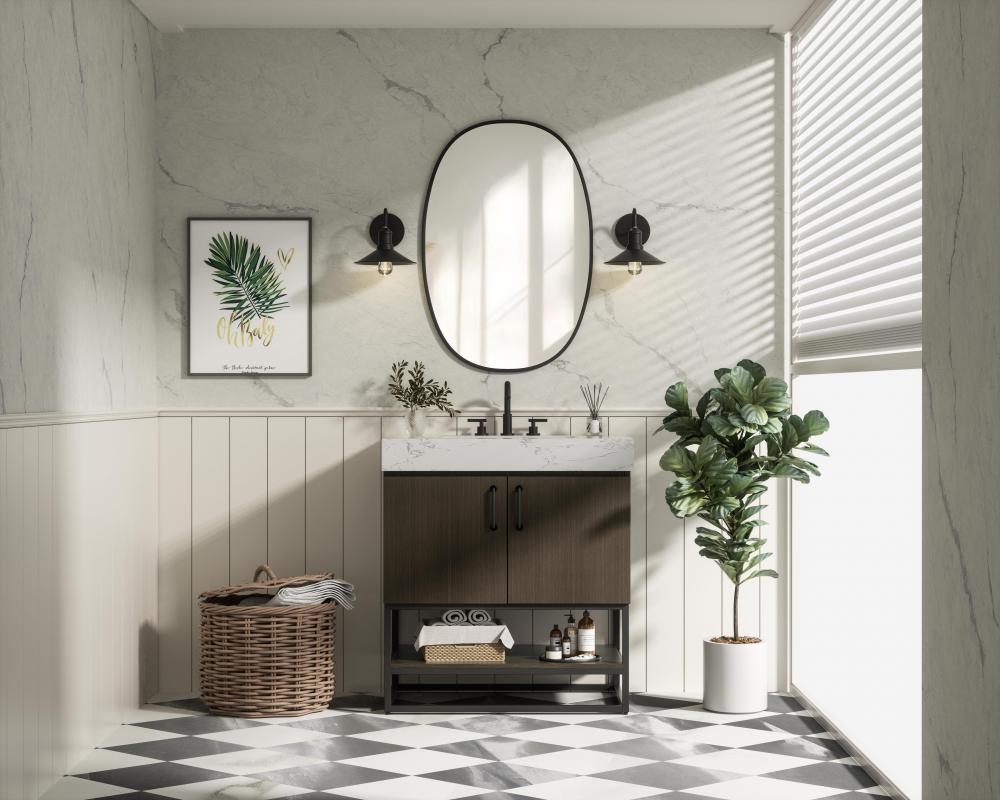 Flat panel designs create a minimalist and modern look, giving the vanity clean lines while maintaining a subtle, farmhouse-inspired charm.