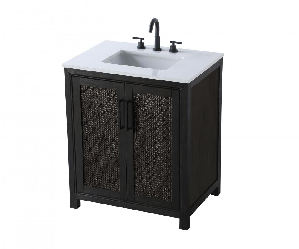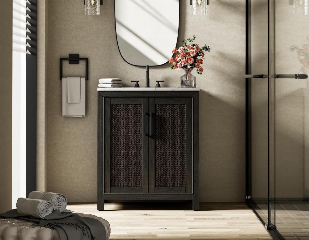 Perfect for those with an eye for detail and quality, this transitional vanity blends modern design with timeless elegance. Available in five stunning finishes, from Crisp White to Linen Oak, the wood grain visuals of the oak options bring warmth and character to any bathroom. The caning design on the Shaker-style door panels adds texture and a touch of refinement, while the soft-closing doors ensure smooth, quiet functionality. Topped with a white engineered marble countertop, the vanity offers both luxury and practicality, complete with pre-drilled faucet holes for customization. A concealed overflow and U-shaped shelf for plumbing make installation effortless, and the slender black metal pulls provide a sleek contrast.