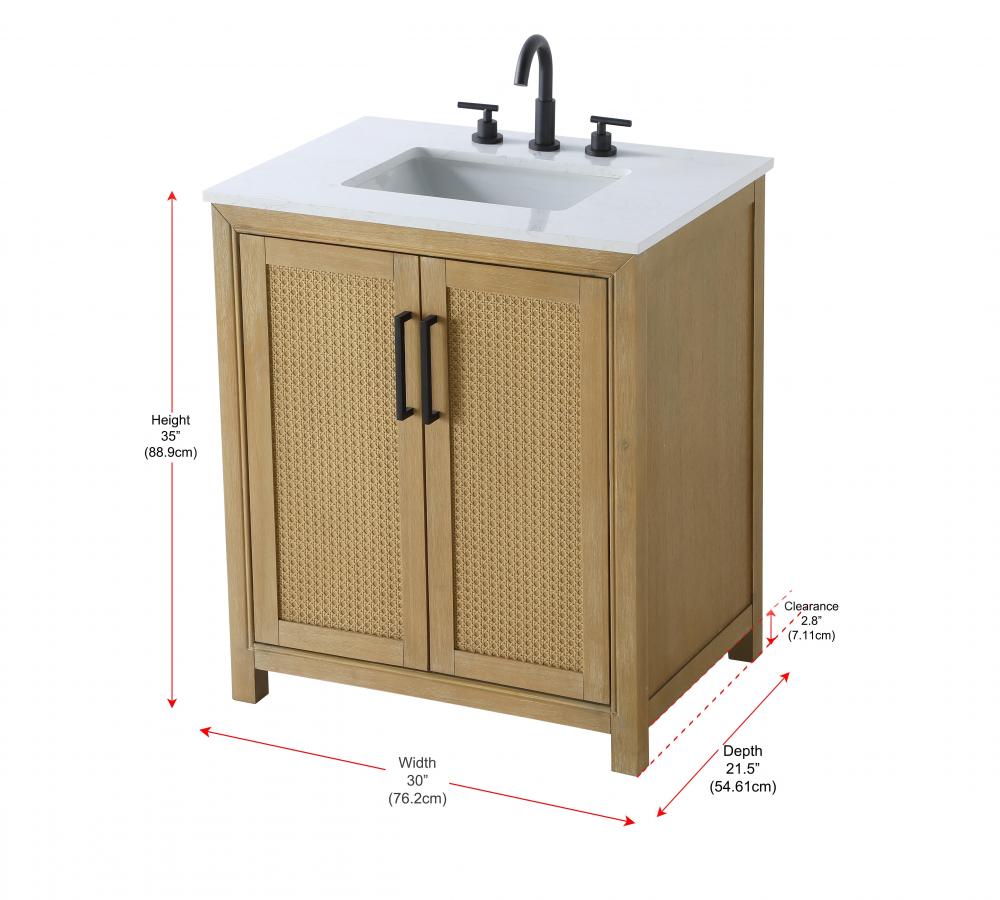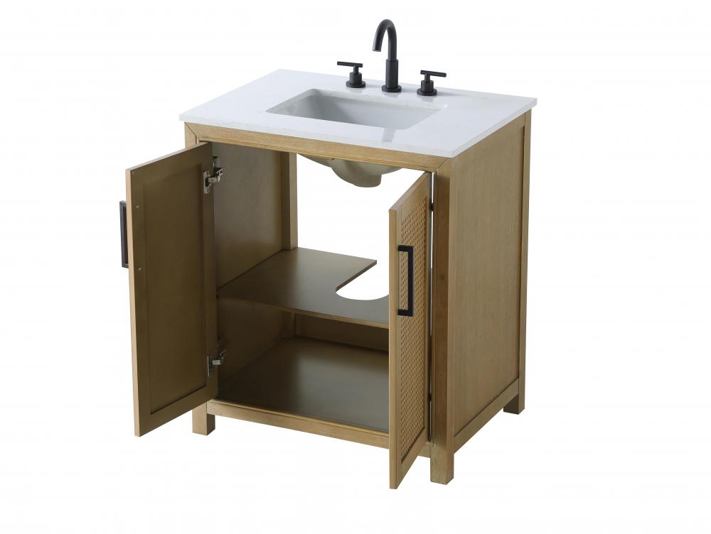 Perfect for those with an eye for detail and quality, this transitional vanity blends modern design with timeless elegance. Available in five stunning finishes, from Crisp White to Linen Oak, the wood grain visuals of the oak options bring warmth and character to any bathroom. The caning design on the Shaker-style door panels adds texture and a touch of refinement, while the soft-closing doors ensure smooth, quiet functionality. Topped with a white engineered marble countertop, the vanity offers both luxury and practicality, complete with pre-drilled faucet holes for customization. A concealed overflow and U-shaped shelf for plumbing make installation effortless, and the slender black metal pulls provide a sleek contrast.