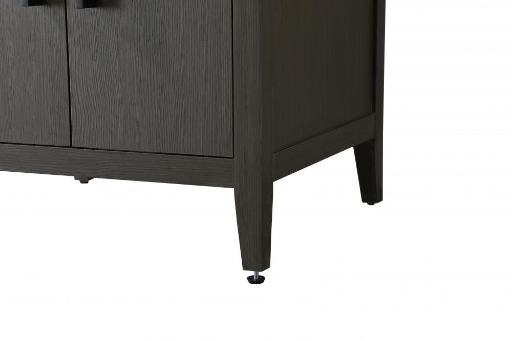 The vanity stands on tapered 5-inch solid wood legs with levelers for a balanced, polished look, combining modern style with practicality.