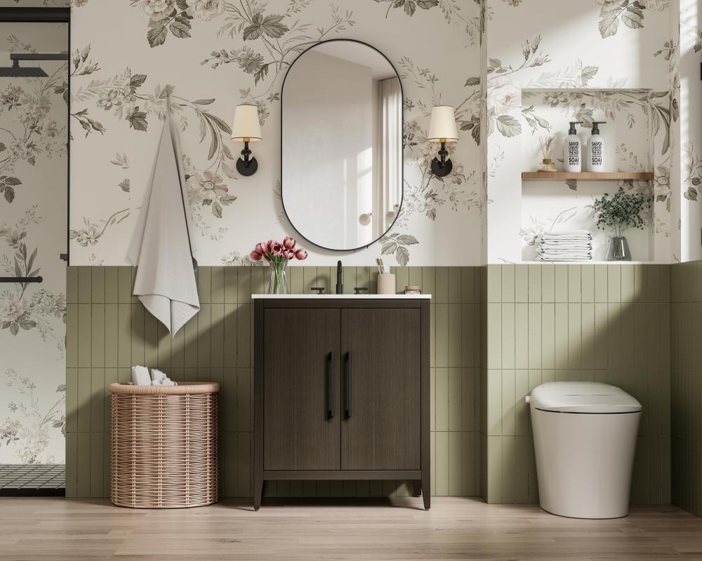 The minimalist flat door panels create a sleek, modern appearance, perfect for blending into transitional and contemporary bathroom designs.