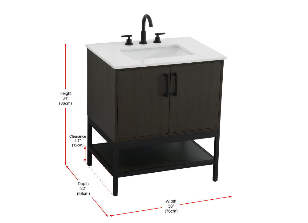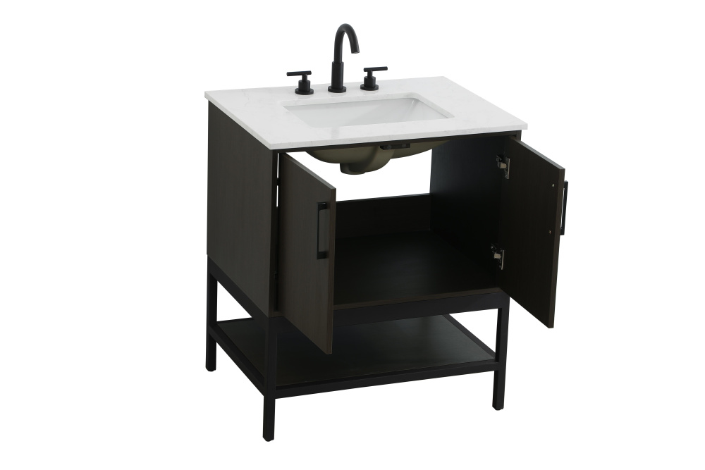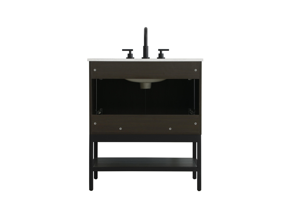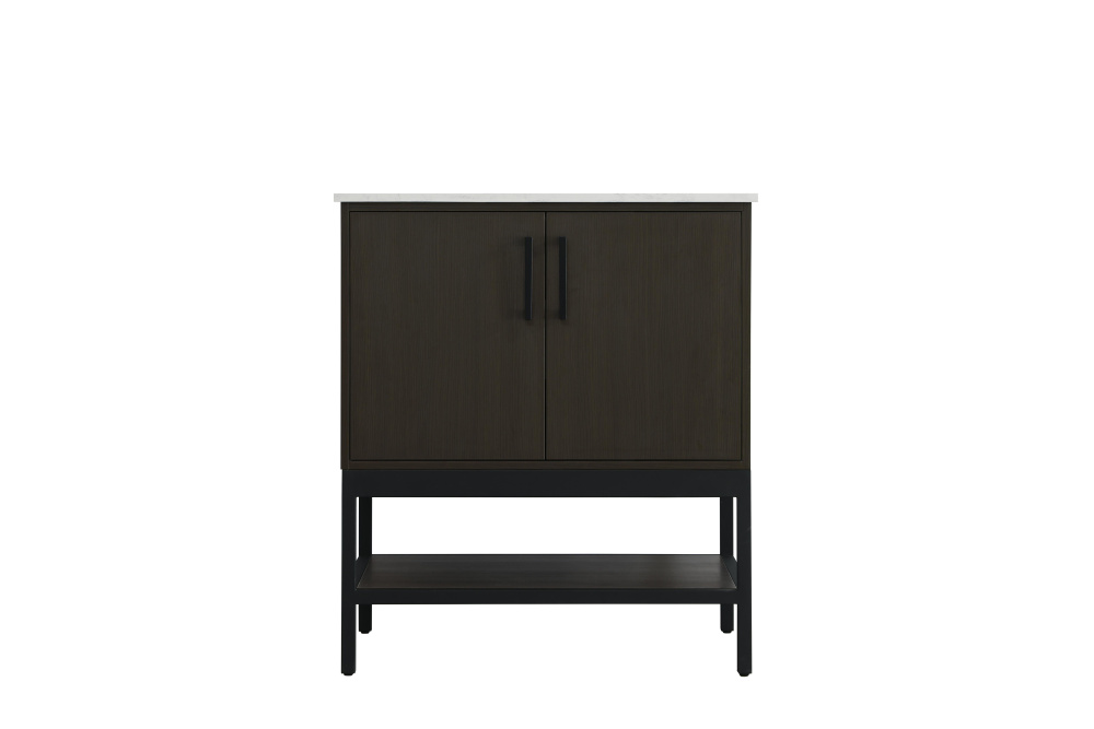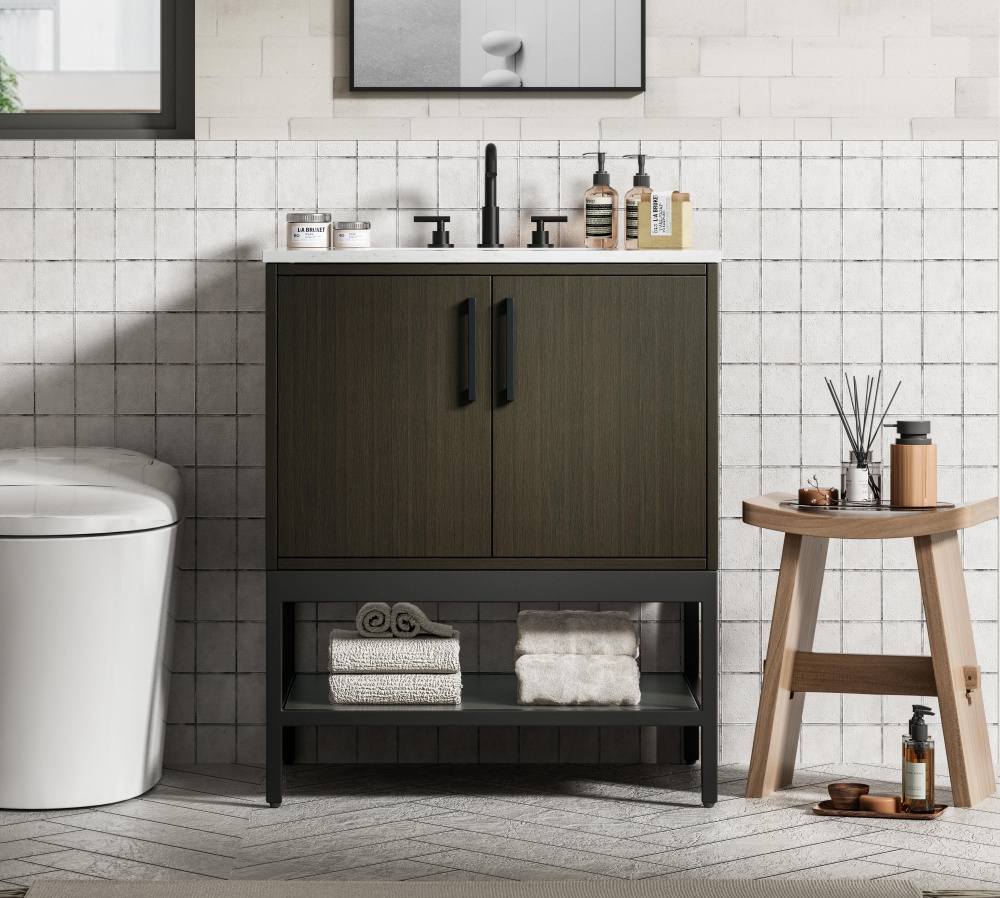 Upgrade your bathroom with this modern bathroom vanity that combines form and function effortlessly. Its sleek wood veneer cabinetry, paired with a bold black metal frame, brings a clean, contemporary vibe to any space. Designed with practicality in mind, the cabinet organizes your essentials, as well as an open lower shelf for added storage or display. The durable engineered marble countertop is built to withstand daily use, while the undermount porcelain sink ensures easy maintenance. Complete with matte black hardware and pre-drilled features for effortless installation, this vanity is the perfect centerpiece to refresh your bathroom with style and efficiency.
