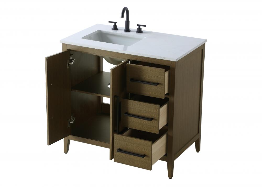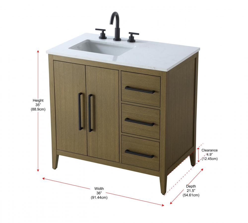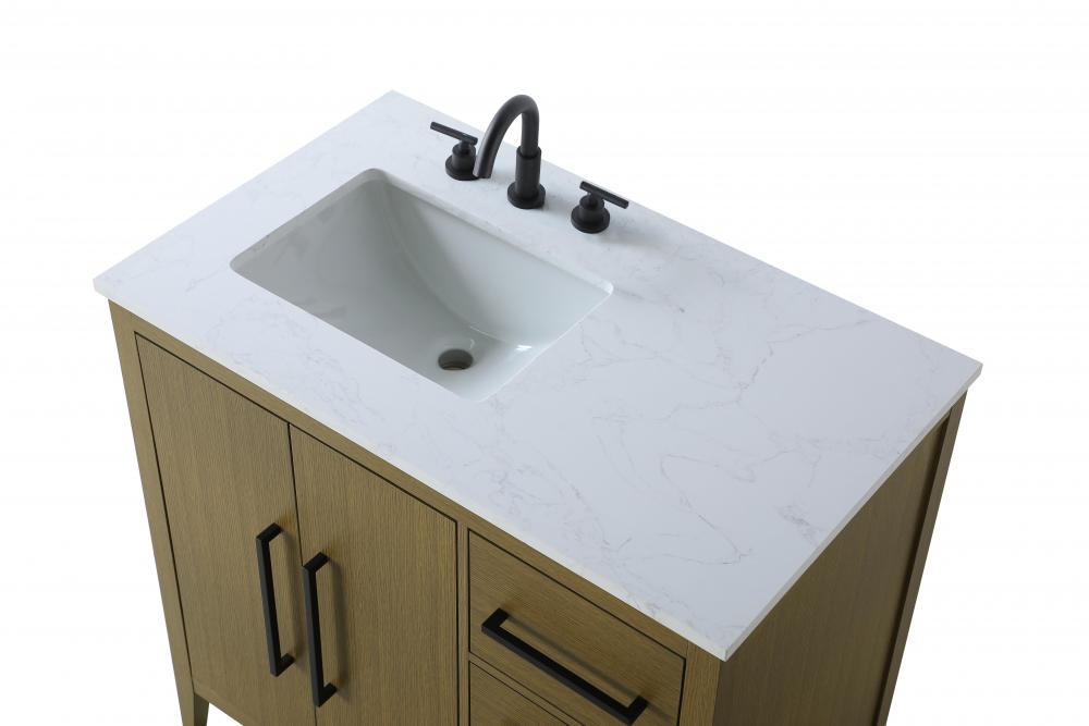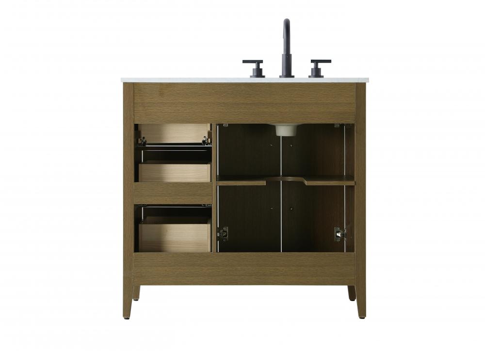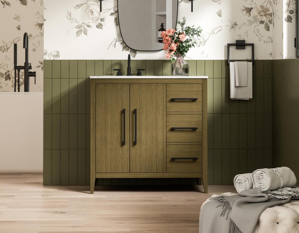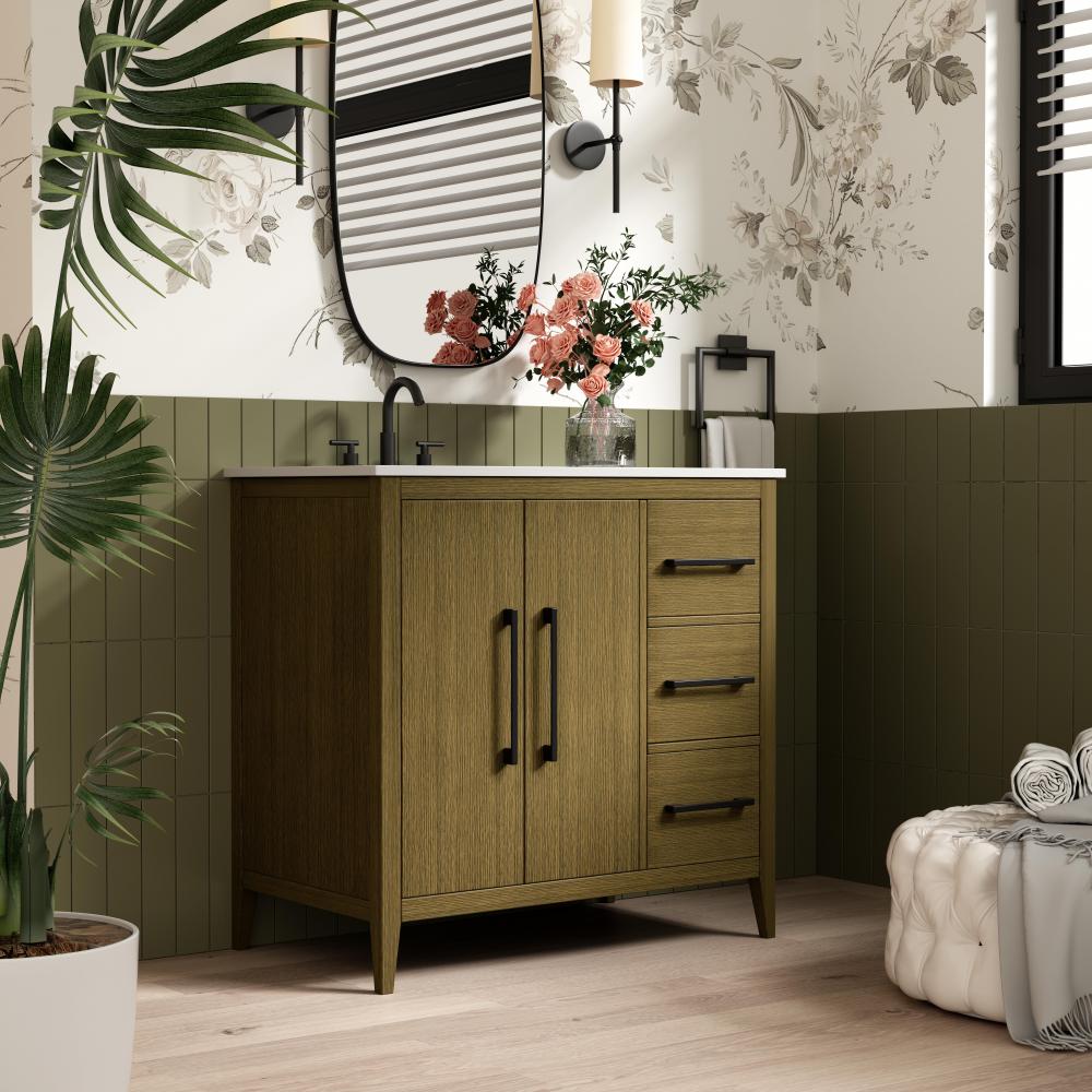 Bring both elegance and practicality to your bathroom with this transitional vanity, available in a selection of rich finishes that highlight the beauty of faux wood grain in shades of mocha, chestnut, and honey, along with classic white and modern grey. The flat door panels and sleek black metal pulls create a minimalist yet refined aesthetic, while the soft-closing drawers and tapered legs with levelers provide smooth, functional operation. Topped with a luxurious white engineered marble countertop and featuring a porcelain sink, this vanity combines timeless style with modern efficiency. Thoughtfully designed with U-shaped cutout for plumbing, it offers ample storage and easy installation, making it the perfect centerpiece for any bathroom.