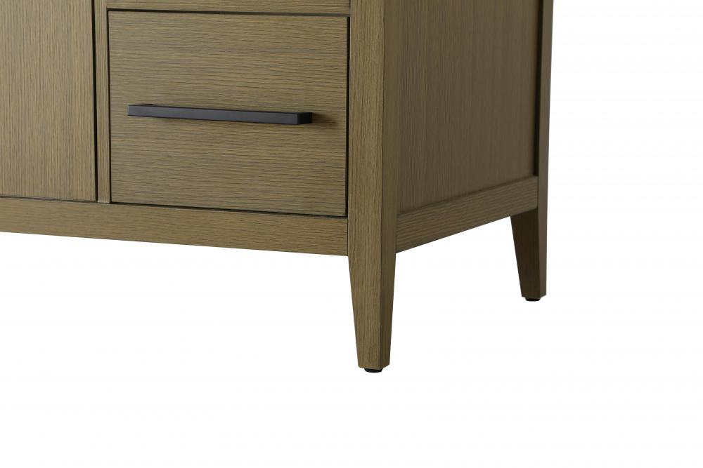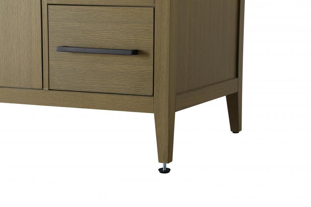 The vanity stands on tapered 5-inch solid wood legs with levelers for a balanced, polished look, combining modern style with practicality.