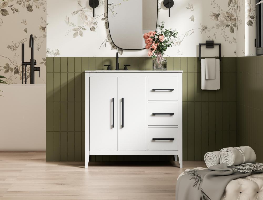 Bring both elegance and practicality to your bathroom with this transitional vanity, available in a selection of rich finishes that highlight the beauty of faux wood grain in shades of mocha, chestnut, and honey, along with classic white and modern grey. The flat door panels and sleek black metal pulls create a minimalist yet refined aesthetic, while the soft-closing drawers and tapered legs with levelers provide smooth, functional operation. Topped with a luxurious white engineered marble countertop and featuring a porcelain sink, this vanity combines timeless style with modern efficiency. Thoughtfully designed with U-shaped cutout for plumbing, it offers ample storage and easy installation, making it the perfect centerpiece for any bathroom.