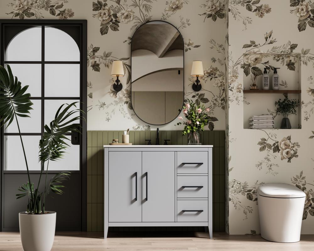 Bring both elegance and practicality to your bathroom with this transitional vanity, available in a selection of rich finishes that highlight the beauty of faux wood grain in shades of mocha, chestnut, and honey, along with classic white and modern grey. The flat door panels and sleek black metal pulls create a minimalist yet refined aesthetic, while the soft-closing drawers and tapered legs with levelers provide smooth, functional operation. Topped with a luxurious white engineered marble countertop and featuring a porcelain sink, this vanity combines timeless style with modern efficiency. Thoughtfully designed with U-shaped cutout for plumbing, it offers ample storage and easy installation, making it the perfect centerpiece for any bathroom.