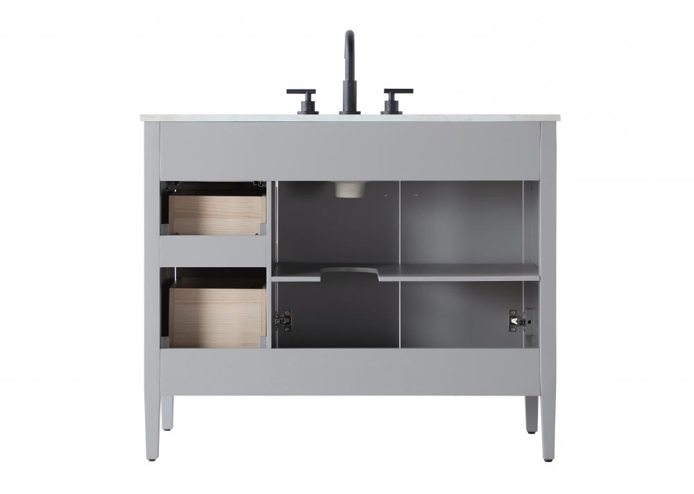 Inside the cabinet, the shelf is thoughtfully designed with a U-shaped cutout to allow for seamless plumbing installation while maintaining storage space.