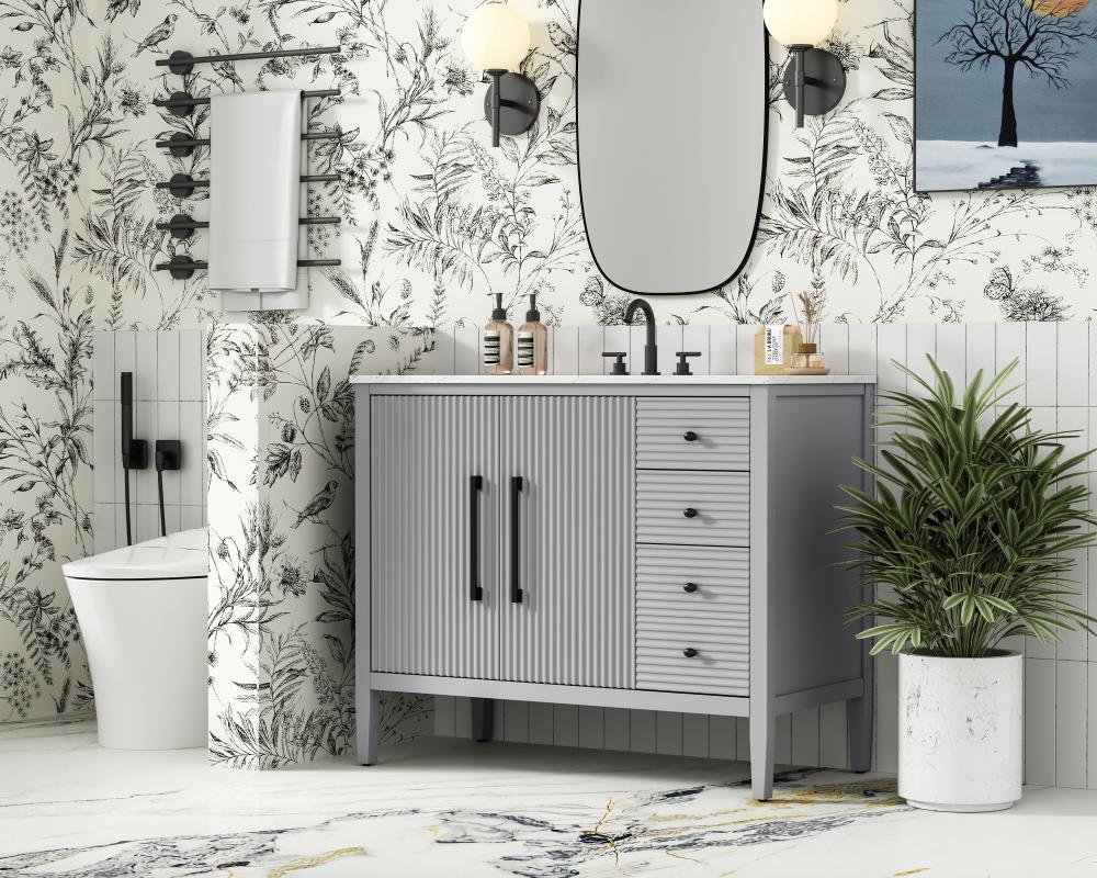 Designed with transitional elegance in mind, this bathroom vanity seamlessly blends traditional elements with modern functionality. Available in five stunning finishes, from the clean sophistication of Crisp White to the natural warmth of Honey Oak, the fluted door and drawer panels add subtle texture and charm. The white engineered marble countertop with natural veining exudes luxury, while the soft-closing doors and drawers with sleek black metal pulls offer a quiet, refined experience. Practicality is never compromised, with features like the U-shaped shelf for plumbing, deeper bottom drawer for ample storage, and pre-drilled faucet holes for easy customization. Whether your style leans modern or classic, this vanity is the perfect balance of beauty and function, appealing to customers with a taste for quality and style.