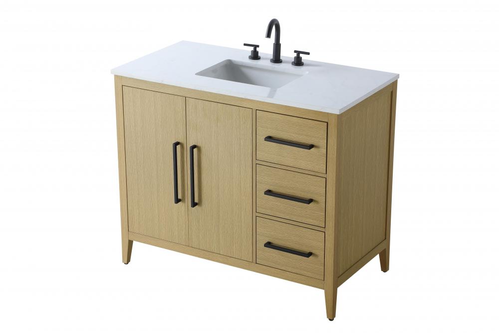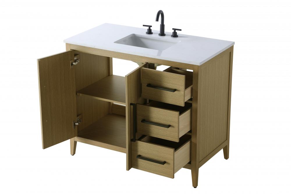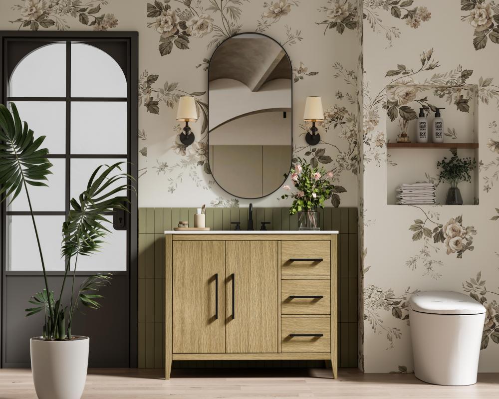Bring both elegance and practicality to your bathroom with this transitional vanity, available in a selection of rich finishes that highlight the beauty of faux wood grain in shades of mocha, chestnut, and honey, along with classic white and modern grey. The flat door panels and sleek black metal pulls create a minimalist yet refined aesthetic, while the soft-closing drawers and tapered legs with levelers provide smooth, functional operation. Topped with a luxurious white engineered marble countertop and featuring a porcelain sink, this vanity combines timeless style with modern efficiency. Thoughtfully designed with U-shaped cutout for plumbing, it offers ample storage and easy installation, making it the perfect centerpiece for any bathroom.