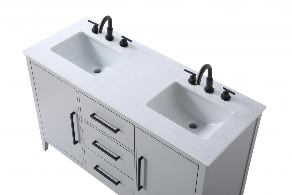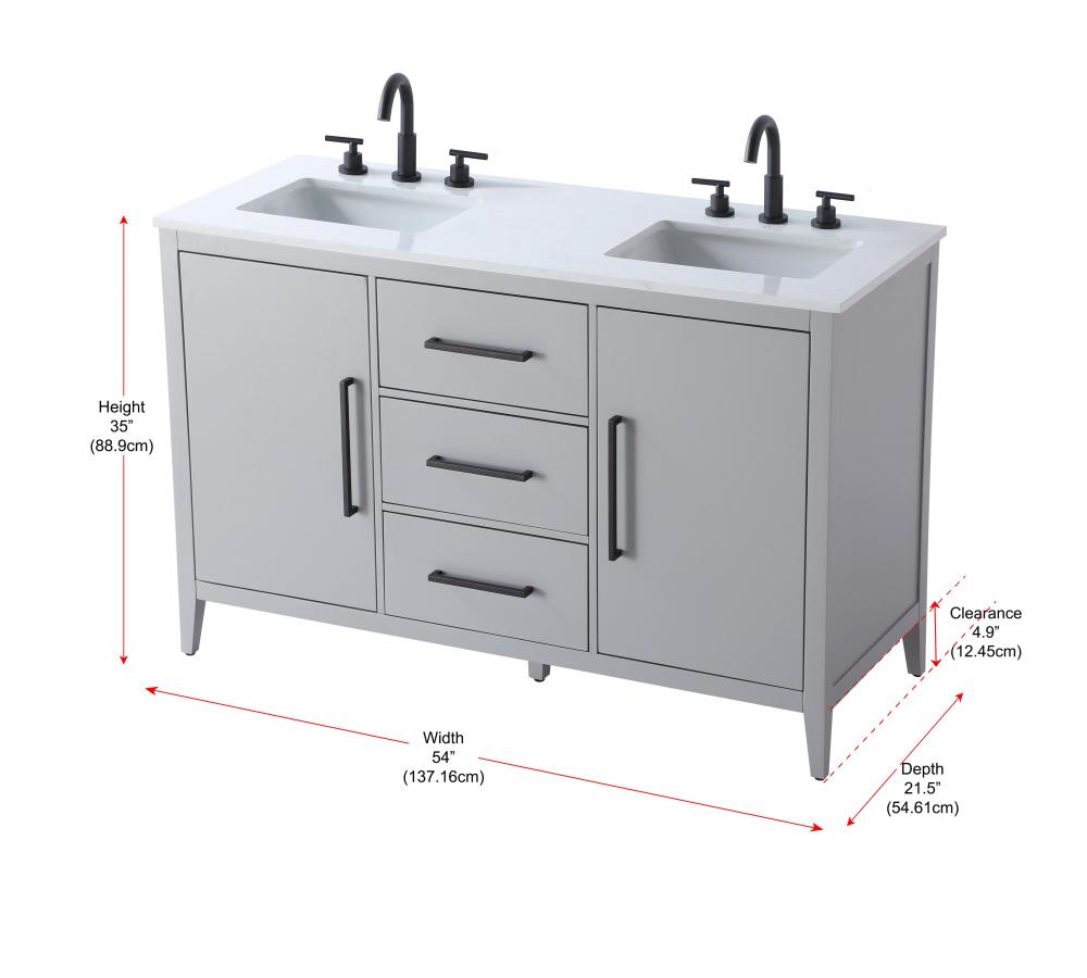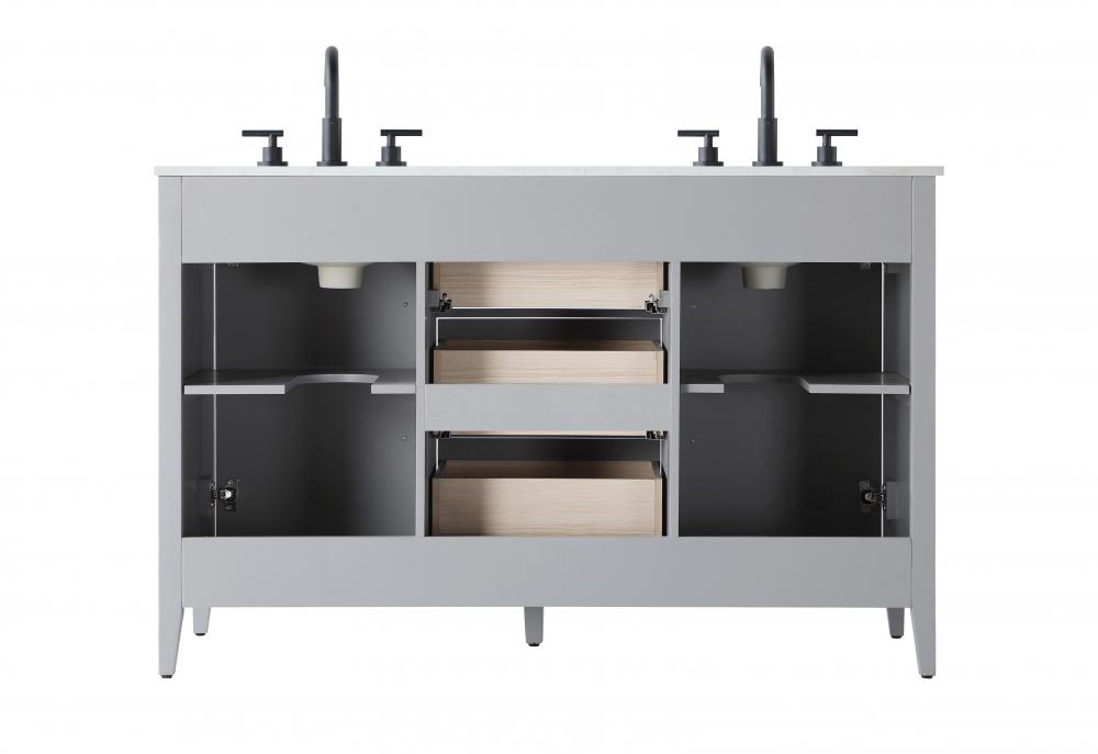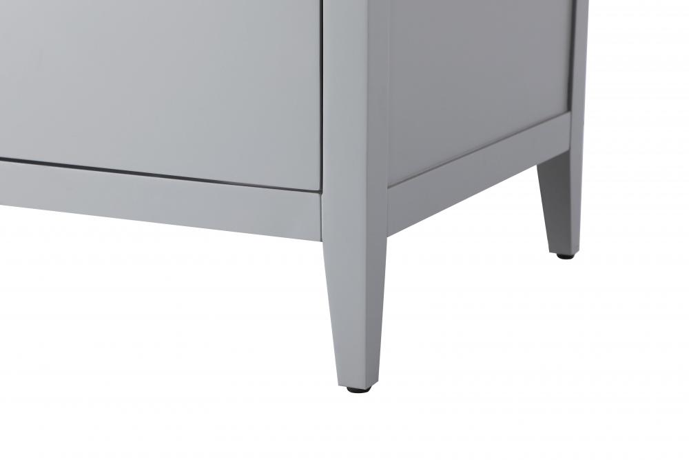 The vanity stands on tapered 5-inch solid wood legs with levelers for a balanced, polished look, combining modern style with practicality.