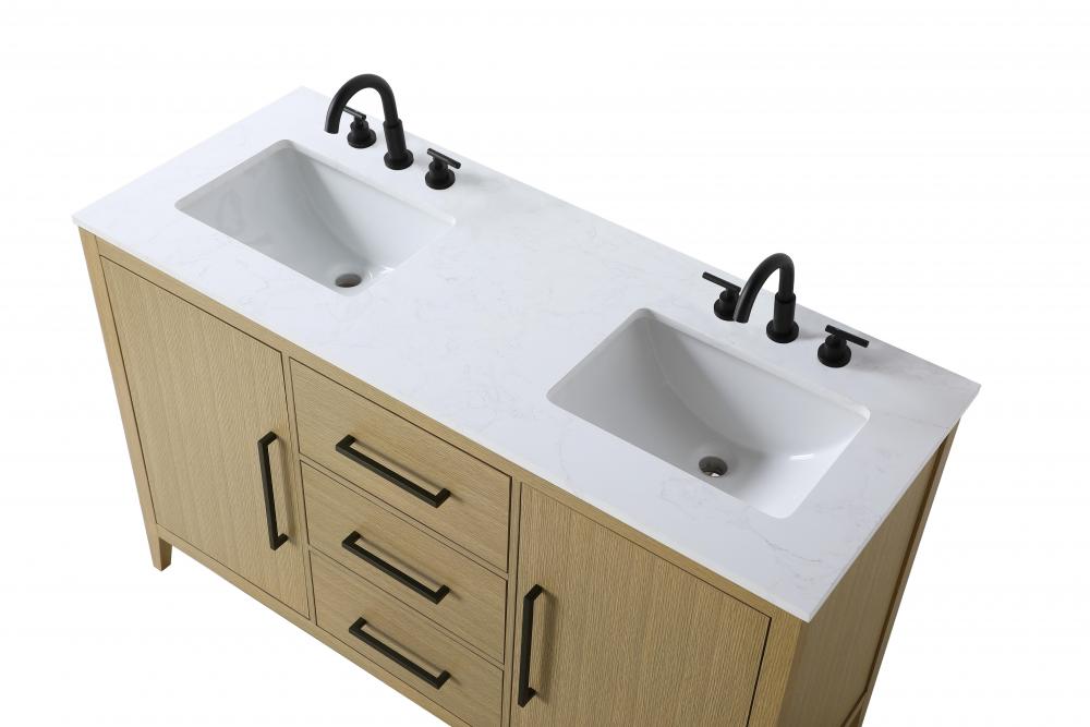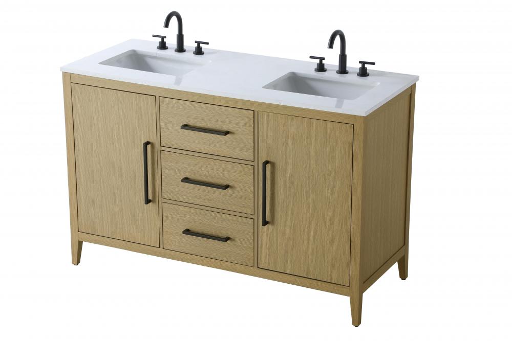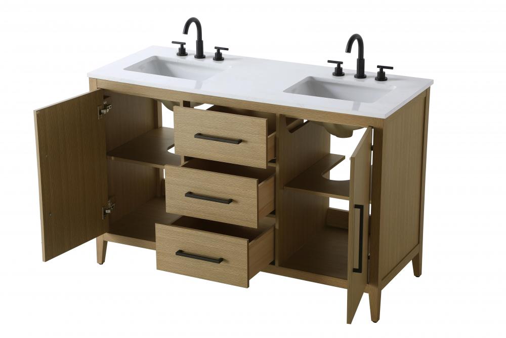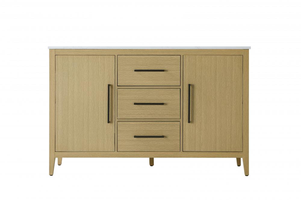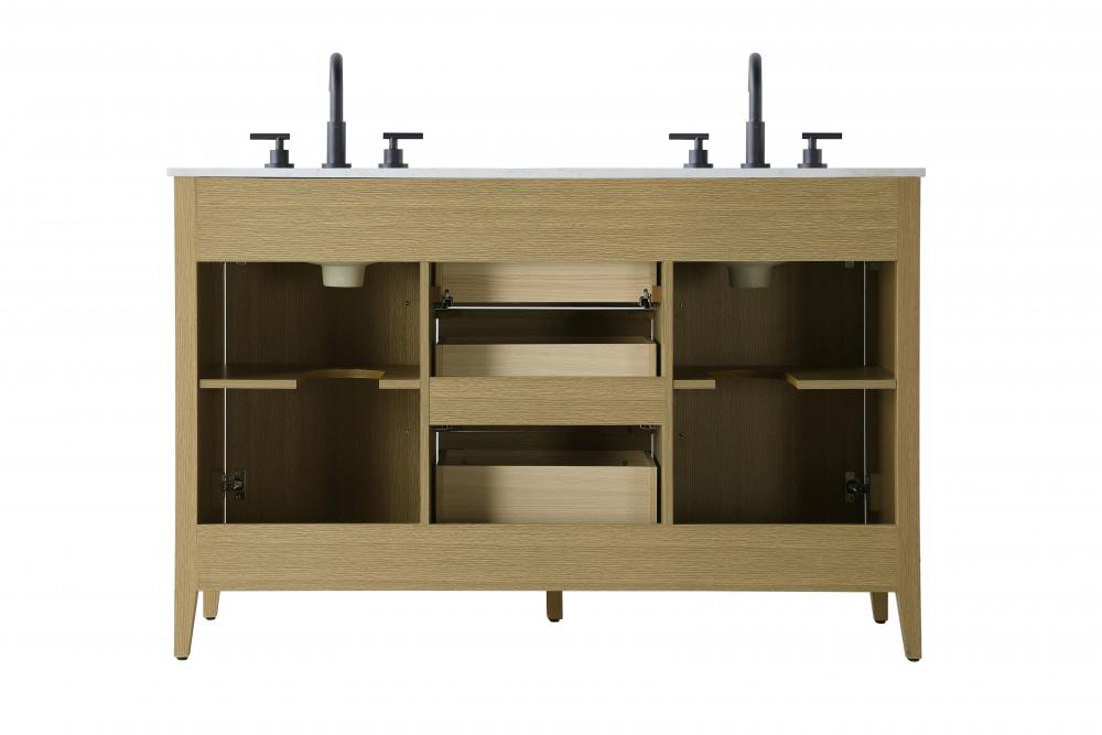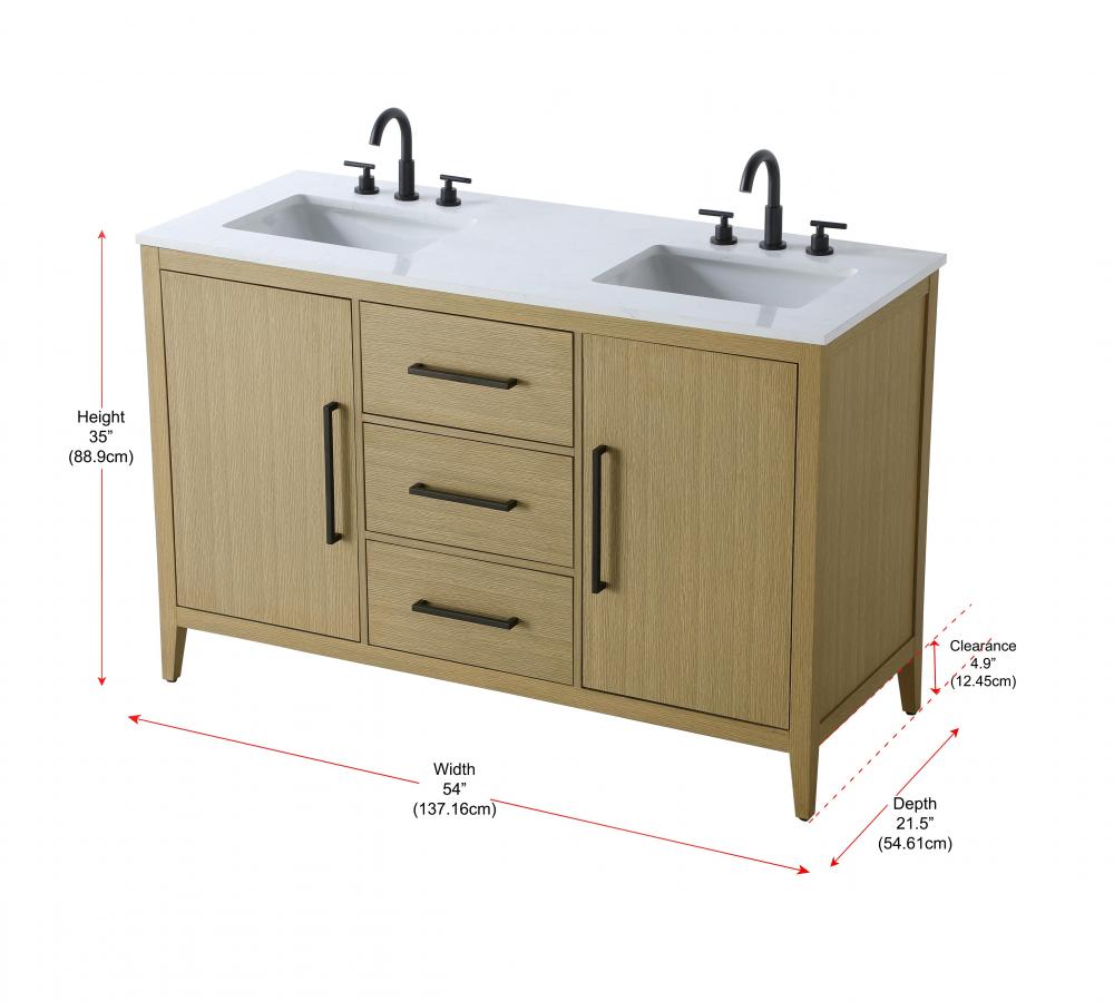 The vanity stands on tapered 5-inch solid wood legs with levelers for a balanced, polished look, combining modern style with practicality.