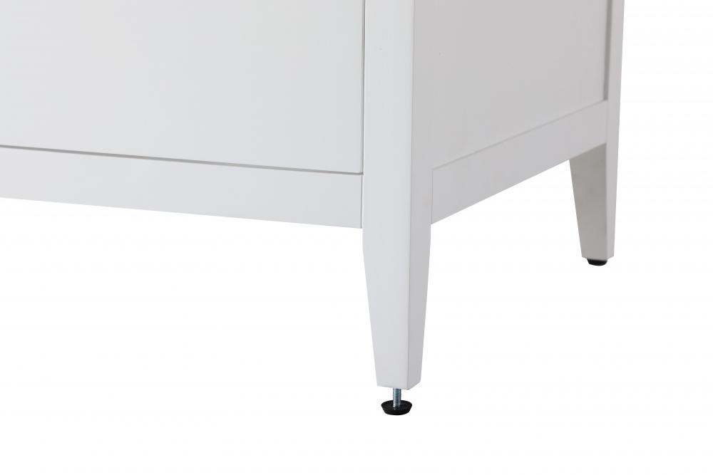 The vanity stands on tapered 5-inch solid wood legs with levelers for a balanced, polished look, combining modern style with practicality.