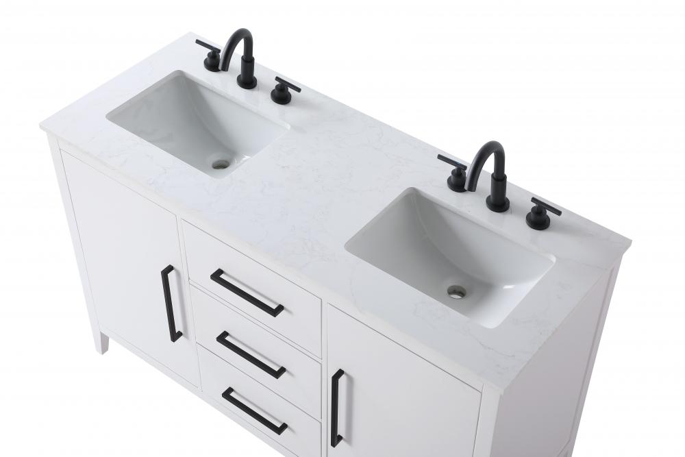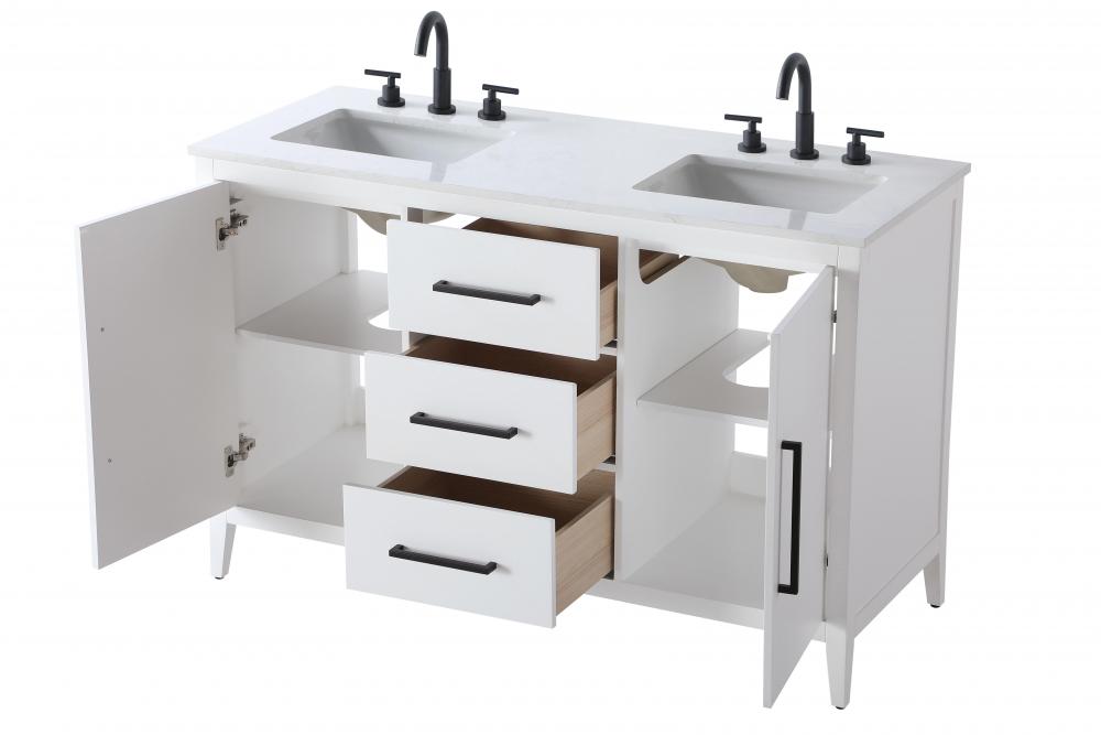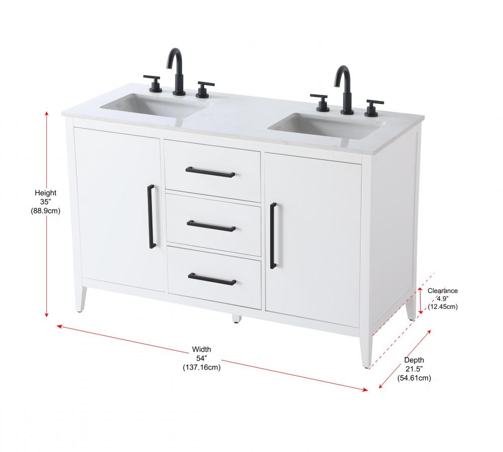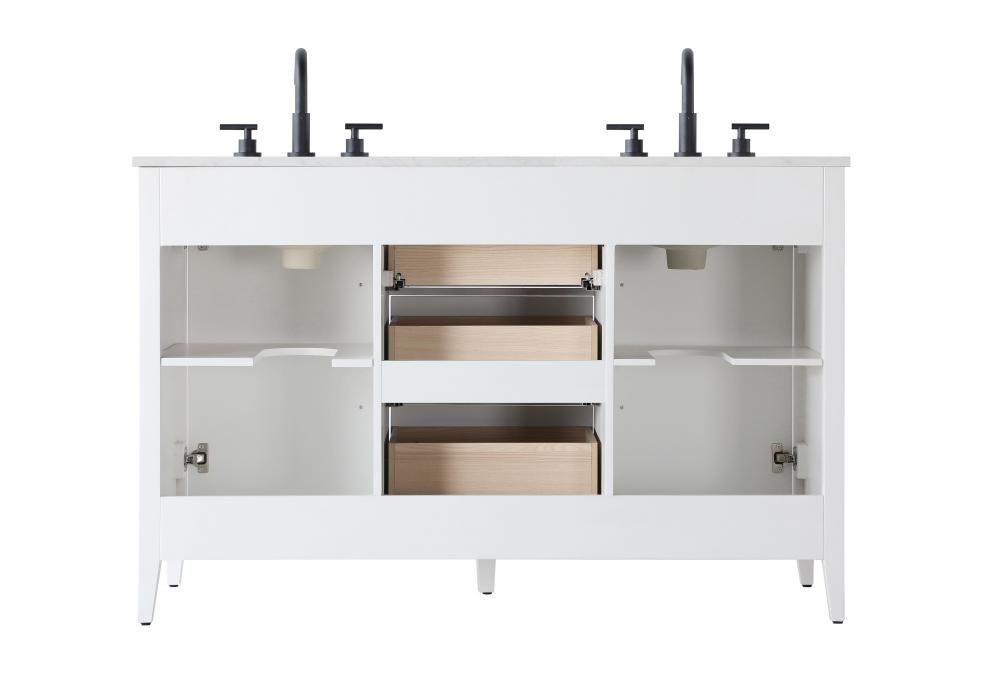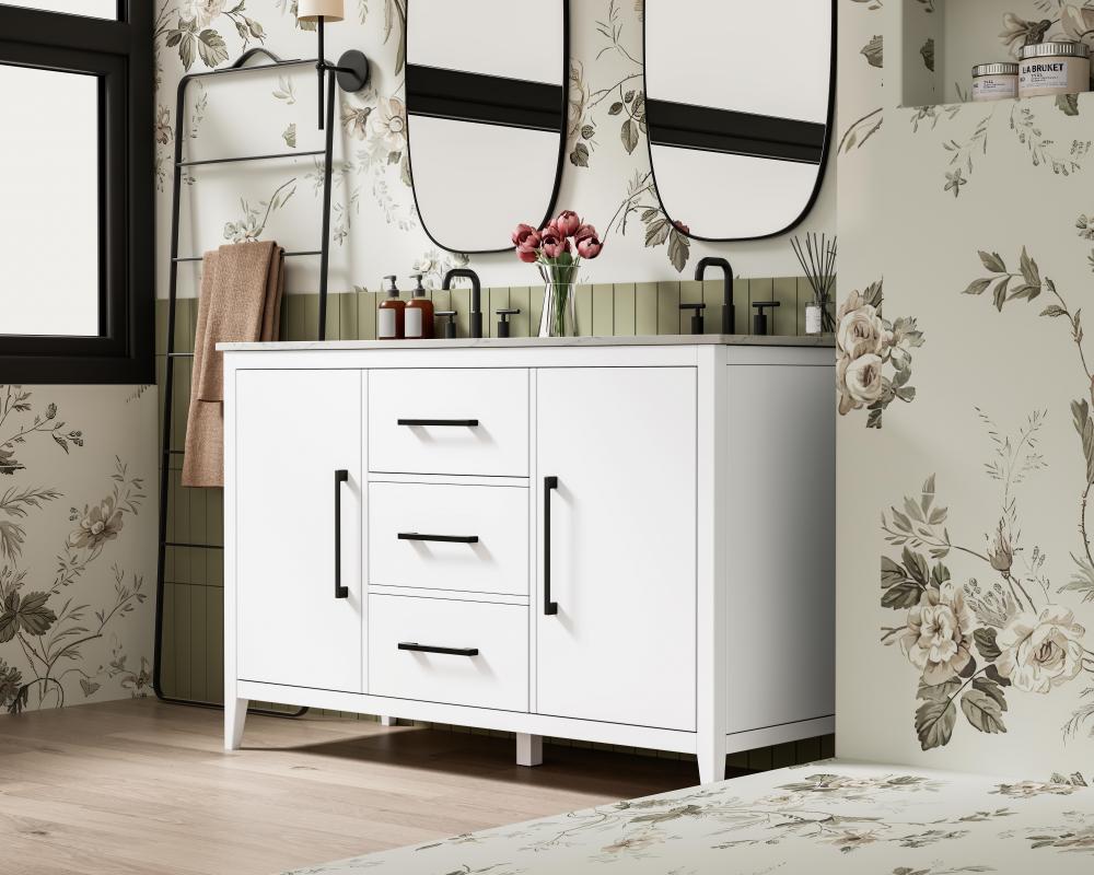 Bring both elegance and practicality to your bathroom with this transitional vanity, available in a selection of rich finishes that highlight the beauty of faux wood grain in shades of mocha, chestnut, and honey, along with classic white and modern grey. The flat door panels and sleek black metal pulls create a minimalist yet refined aesthetic, while the soft-closing drawers and tapered legs with levelers provide smooth, functional operation. Topped with a luxurious white engineered marble countertop and featuring a porcelain sink, this vanity combines timeless style with modern efficiency. Thoughtfully designed with U-shaped cutout for plumbing, it offers ample storage and easy installation, making it the perfect centerpiece for any bathroom.