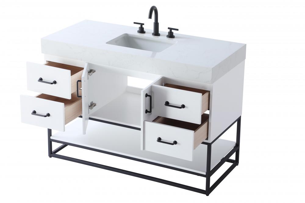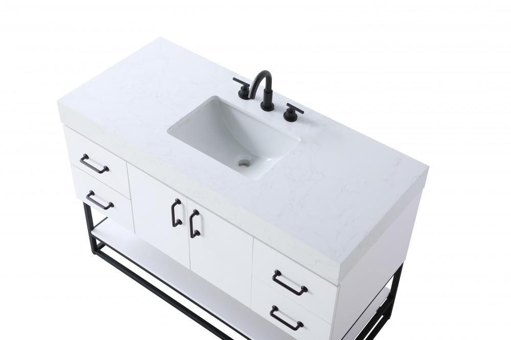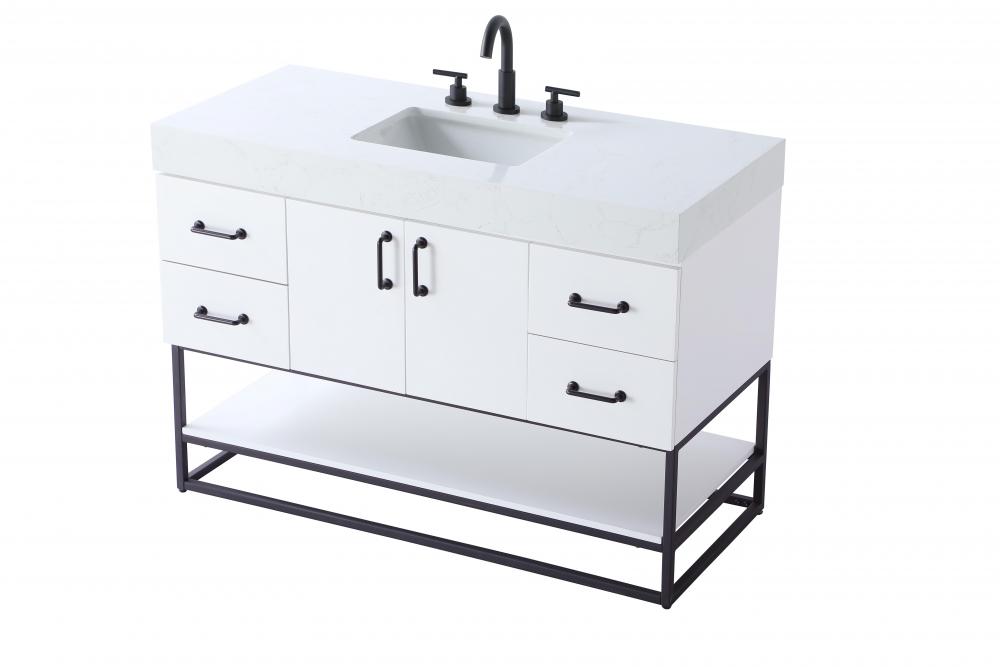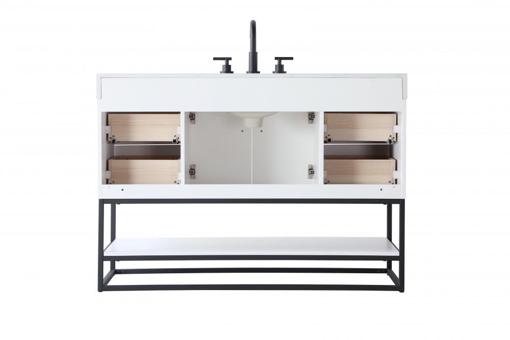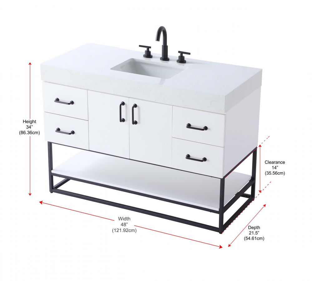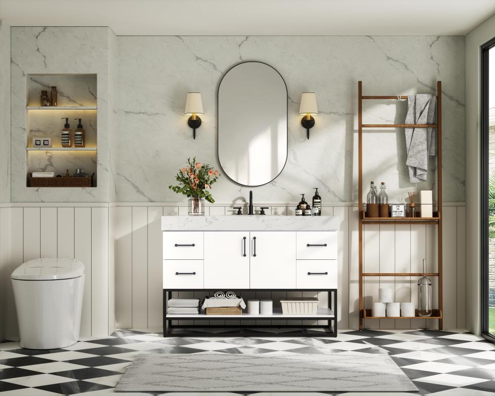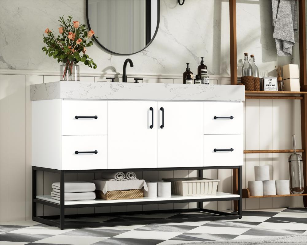 Upgrade your bathroom with this stylish transitional vanity, available in five stunning finishes, from crisp white to warm honey brown, designed to suit a variety of decor styles. The minimalist flat door panels and open wood shelf create a functional yet visually appealing storage solution, while the slender black metal legs elevate the look with modern sophistication. The 4-inch thick white engineered marble countertop, accented with natural veining, adds a luxurious touch, perfectly complemented by soft-closing doors with sleek black metal bar pulls. Thoughtful details like the concealed overflow, back panel cutout for plumbing, and 3 pre-drilled holes for an 8-inch faucet make installation easy and efficient. with a porcelain sink and farmhouse-inspired touches, this vanity brings both elegance and practicality to any bathroom setting.