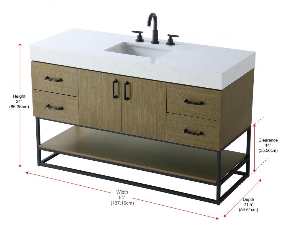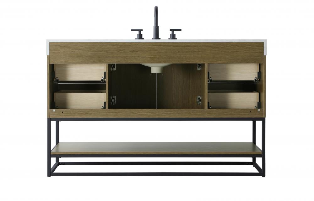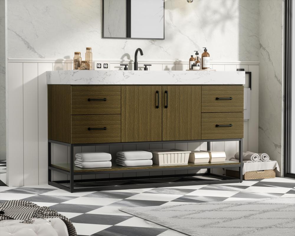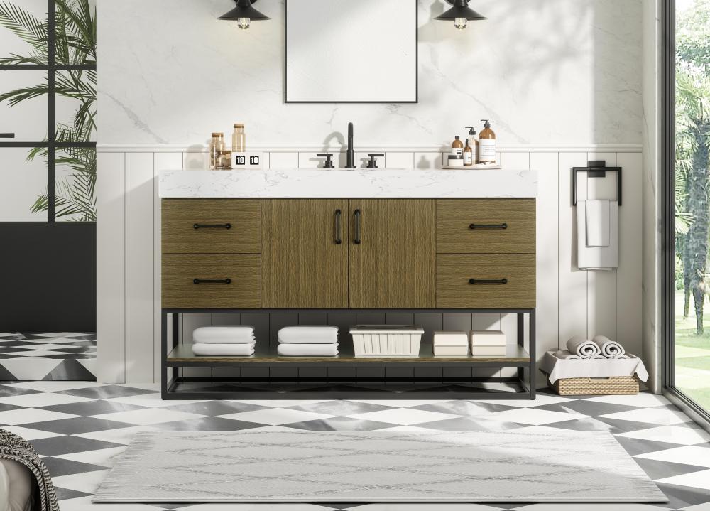 Upgrade your bathroom with this stylish transitional vanity, available in five stunning finishes, from crisp white to warm honey brown, designed to suit a variety of decor styles. The minimalist flat door panels and open wood shelf create a functional yet visually appealing storage solution, while the slender black metal legs elevate the look with modern sophistication. The 4-inch thick white engineered marble countertop, accented with natural veining, adds a luxurious touch, perfectly complemented by soft-closing doors with sleek black metal bar pulls. Thoughtful details like the concealed overflow, back panel cutout for plumbing, and 3 pre-drilled holes for an 8-inch faucet make installation easy and efficient. with a porcelain sink and farmhouse-inspired touches, this vanity brings both elegance and practicality to any bathroom setting.