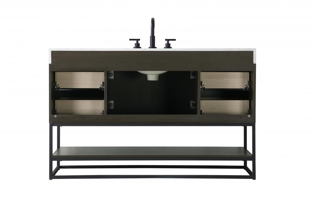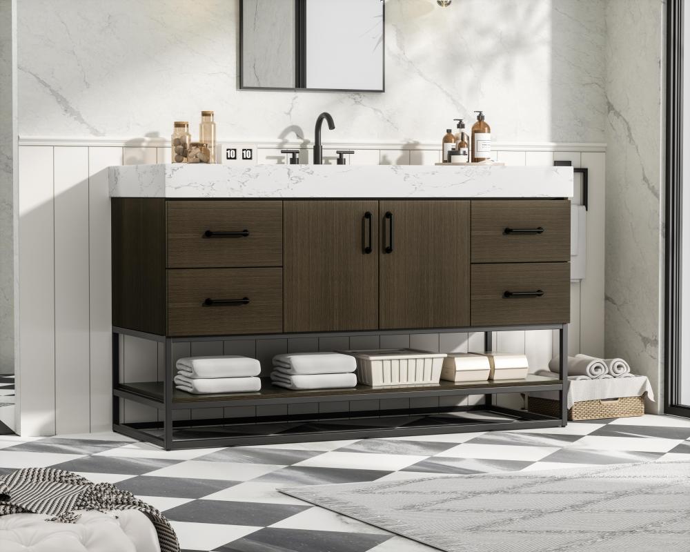 Upgrade your bathroom with this stylish transitional vanity, available in five stunning finishes, from crisp white to warm honey brown, designed to suit a variety of decor styles. The minimalist flat door panels and open wood shelf create a functional yet visually appealing storage solution, while the slender black metal legs elevate the look with modern sophistication. The 4-inch thick white engineered marble countertop, accented with natural veining, adds a luxurious touch, perfectly complemented by soft-closing doors with sleek black metal bar pulls. Thoughtful details like the concealed overflow, back panel cutout for plumbing, and 3 pre-drilled holes for an 8-inch faucet make installation easy and efficient. with a porcelain sink and farmhouse-inspired touches, this vanity brings both elegance and practicality to any bathroom setting.