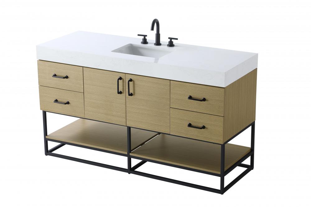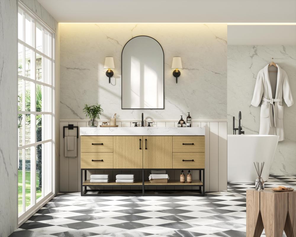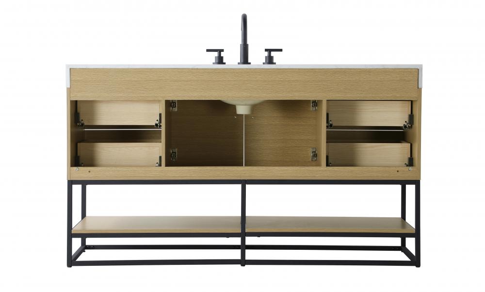 Upgrade your bathroom with this stylish transitional vanity, available in five stunning finishes, from crisp white to warm honey brown, designed to suit a variety of decor styles. The minimalist flat door panels and open wood shelf create a functional yet visually appealing storage solution, while the slender black metal legs elevate the look with modern sophistication. The 4-inch thick white engineered marble countertop, accented with natural veining, adds a luxurious touch, perfectly complemented by soft-closing doors with sleek black metal bar pulls. Thoughtful details like the concealed overflow, back panel cutout for plumbing, and 3 pre-drilled holes for an 8-inch faucet make installation easy and efficient. with a porcelain sink and farmhouse-inspired touches, this vanity brings both elegance and practicality to any bathroom setting.