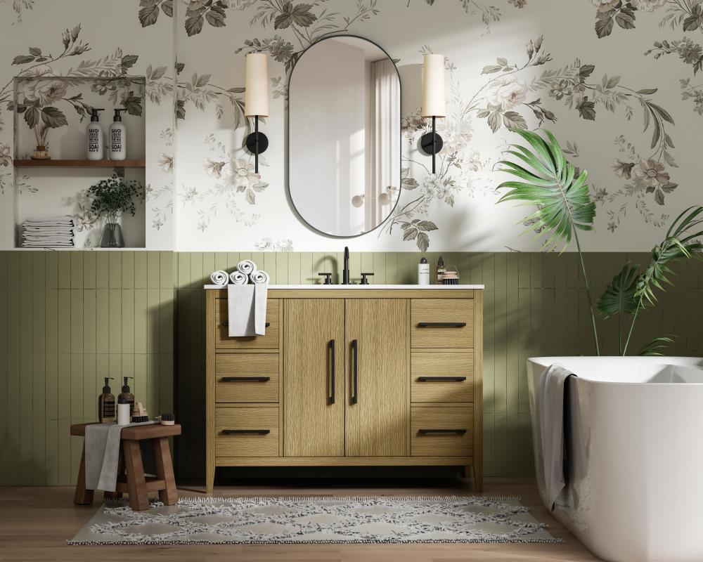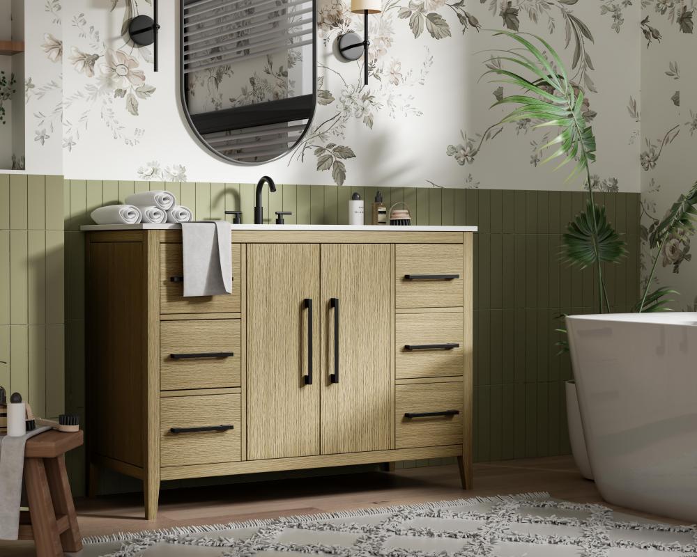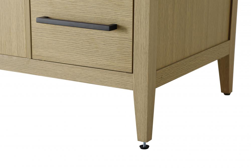 The vanity stands on tapered 5-inch solid wood legs with levelers for a balanced, polished look, combining modern style with practicality.